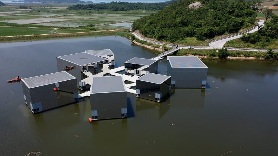 Oltre a progetti architettonici galleggianti, più o meno futuristici, come la Little Island di New York o il WaterNest 100 di Giancarlo Zema, anche il mondo dell’arte ha visto nei bacini d’acqua una nuova materia creativa. Strutture galleggianti permanenti o temporanee diventano luoghi di incontro, riflessione e sperimentazione. In queste installazioni – al crocevia tra arte, architettura e paesaggio – l’acqua è allo stesso tempo materia fisica e simbolica di cambiamento, memoria, e nuove possibilità.