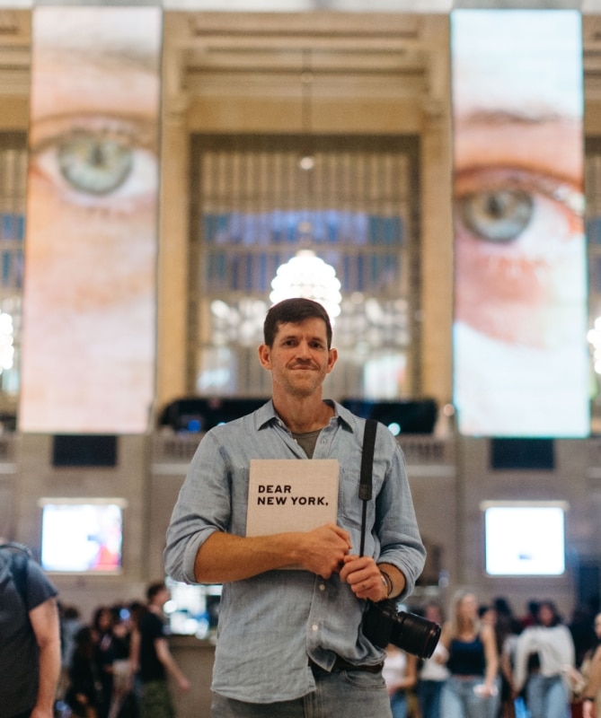 Dear New York, la sua ultima opera, è una vera e propria celebrazione della città su larga scala. Occupa l’intero Grand Central Terminal: dalle banchine della metropolitana alle pareti di Vanderbilt Hall, fino ai 150 schermi digitali del Main Concourse, che per due settimane hanno abbandonato le pubblicità e gli annunci della Metropolitan Transportation Authority per diventare parte dell’installazione. Sui muri scorrono ritratti e testi tratti da Humans of New York, trasformando lo snodo ferroviario più iconico della città in una lettera d’amore collettiva. Vanderbilt Hall ospita inoltre due mostre parallele: una dedicata a fotografi professionisti, selezionati da una open call, e una che riunisce oltre seicento lavori di studenti delle scuole pubbliche di New York.