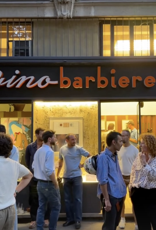 La facciata è quella di sempre: cornici in pietra, vetrate strette e la grande insegna nera con la scritta “Gino barbiere” in corsivo bianco e arancione.