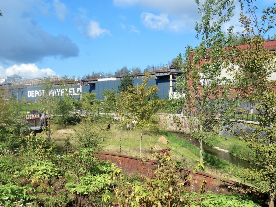 Mayfield comprende anche la più lunga sezione scoperta del Medlock nel centro della città, un tratto di 400 metri di acqua limpida, riportandolo in superficie dopo un precedente sotterramento. Il parco contiene 120 alberi, 120.000 piante e arbusti, un grande prato pubblico con posti a sedere in stile anfiteatro, passerelle lungo il fiume e un’ampia area giochi.