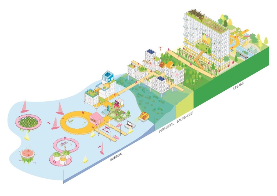 Fondamentale per le proposte del team è il riconoscimento che gli approcci tradizionali ai waterfront urbani, che regolano il proprio rapporto con l’acqua attraverso infrastrutture rigide, non sono più efficaci in un’epoca di innalzamento del livello del mare e di eventi meteorologici estremi sempre più frequenti.