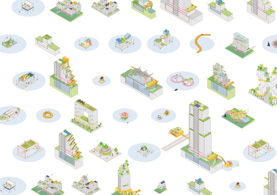 Espandendo la proposta, MVRDV ha sviluppato un catalogo con una strategia sia per i nuovi edifici sia per la trasformazione di singole strutture esistenti. Il vasto catalogo comprende estensioni verticali di case a schiera adatte alle inondazioni con terrazze per la comunità, come isole di habitat galleggianti e grattacieli ridotti allo scheletro strutturale per ospitare programmi pubblici flessibili. Ogni voce del catalogo, inoltre, è classificata in base al posto che può occupare nella città futura, assegnando una posizione in relazione al paesaggio costiero riqualificato, con alcune che si troveranno permanentemente sull’acqua, altre che occuperanno la zona intertidale, e altre ancora che si troveranno sulla terraferma, fuori dalla portata prevista del mare. Nel caso della trasformazione di edifici esistenti, le proposte sono classificate in base al grado di drammaticità dell'intervento e alla quantità di innalzamento del livello del mare che possono accogliere.
