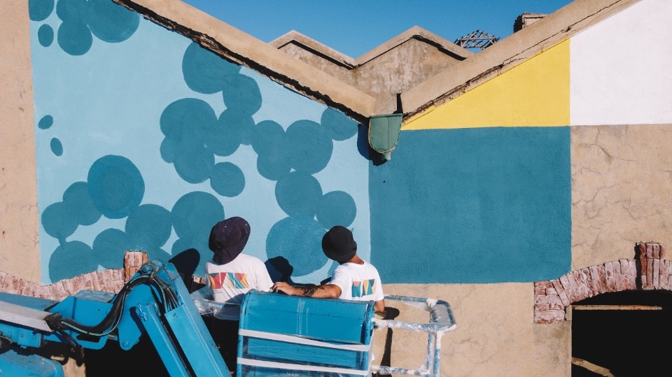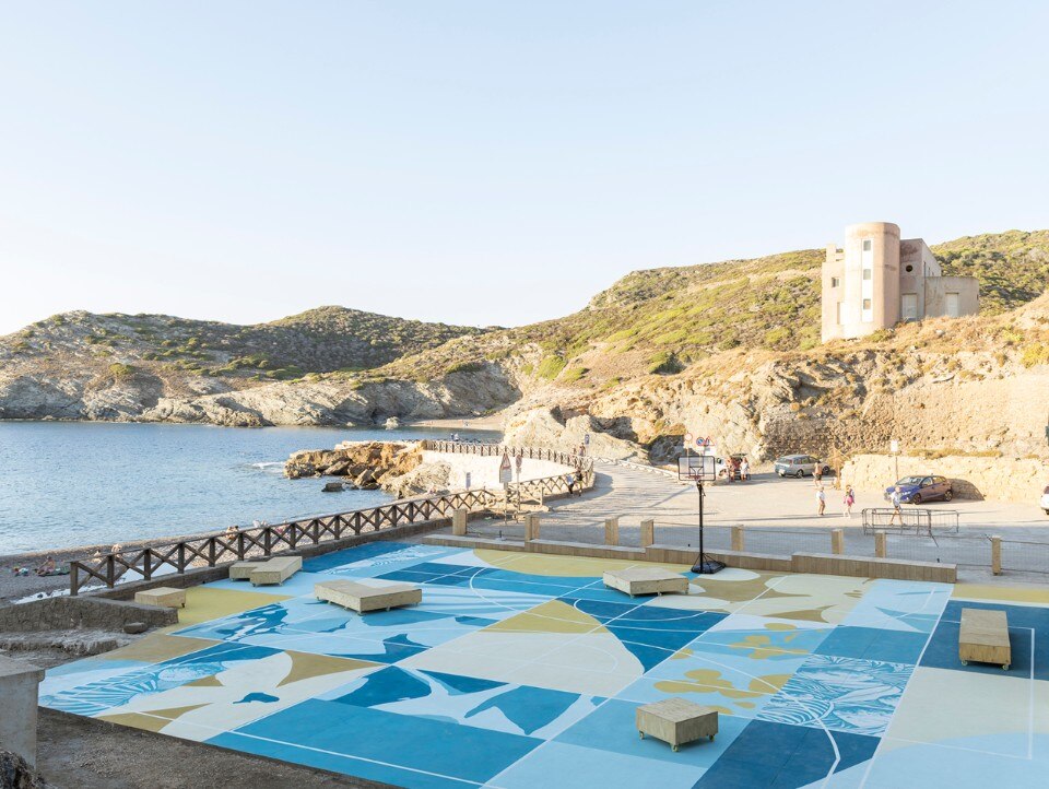 Gli artisti Tellas (Fabio Schirru) e 2bleene (Natalia Nicole Rodriguez) hanno contribuito realizzando un’installazione artistica che colora l’intera piazza, con diverse tonalità di blu e ocra. Lo spazio assume così il ruolo di collegamento creativo tra mare, terra e cielo, caratterizzando l’area dedicata alle nuove attività culturali e sportive. L’opera mette in evidenza le caratteristiche architettoniche degli ex magazzini che un tempo conservavano i materiali minerari, e allo stesso tempo delinea i confini dei campi da basket, pallavolo e pickleball, sottolineando il ruolo del gioco come attività centrale della comunità e della società.