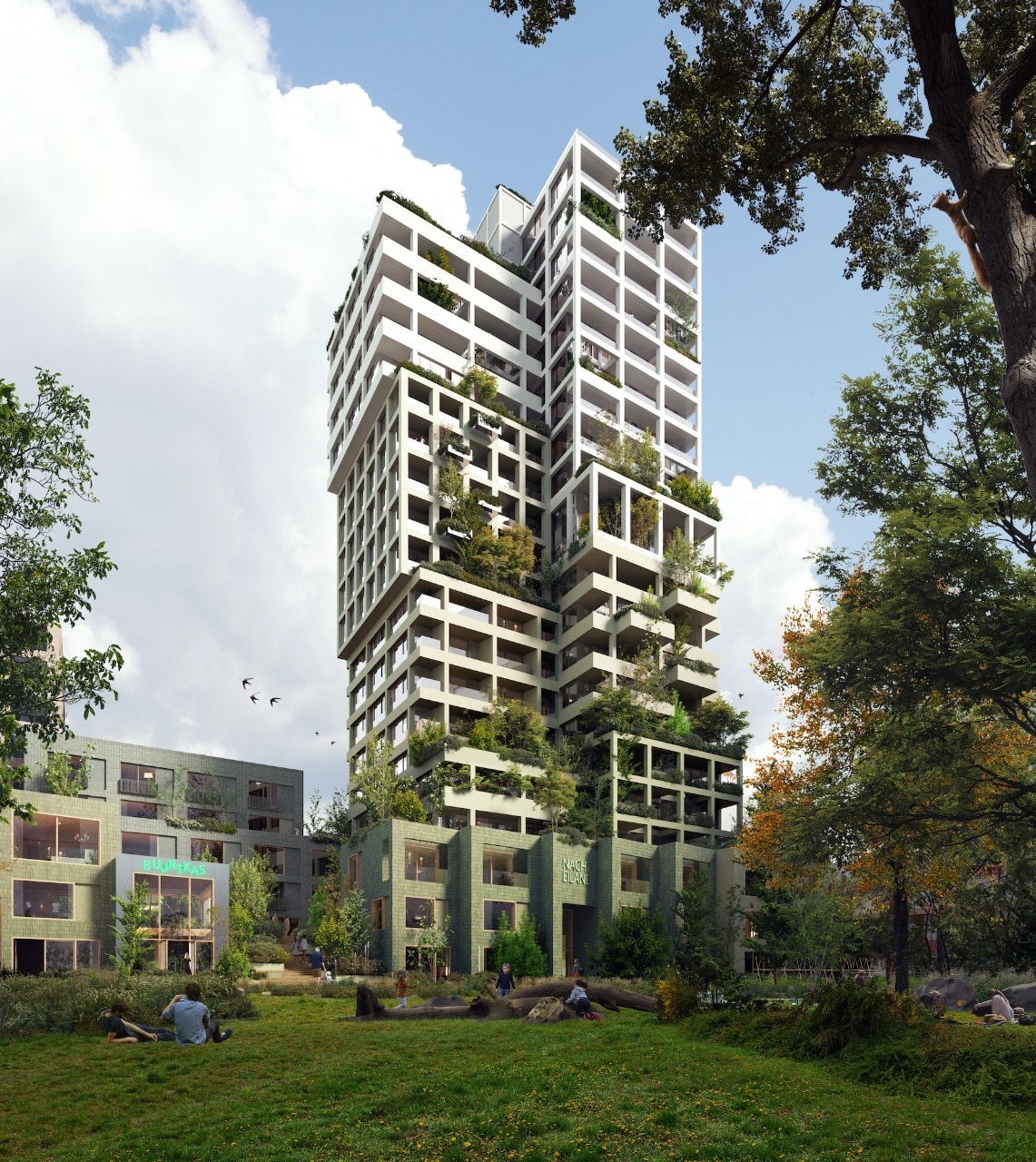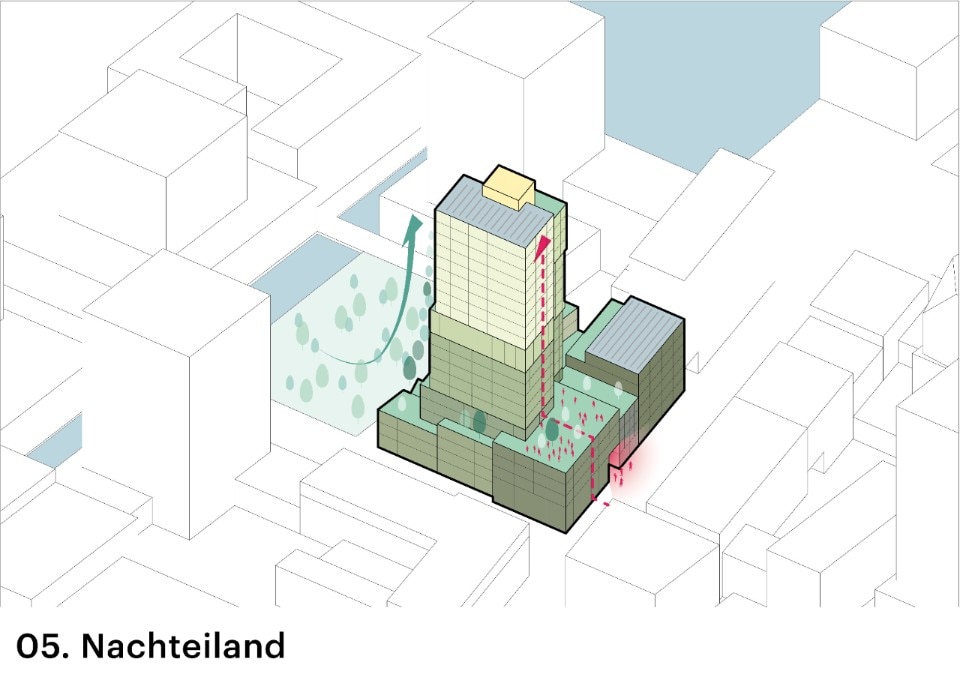 Chiamato ufficialmente Nachteiland – tradotto dall’olandese “isola notturna”, in riferimento all’opera del coreografo Rudi van Dantzig da cui prende il nome la via principale del quartiere – l’edificio si innalza fino a 70 metri e si compone di blocchi che aumentano gradualmente di dimensioni via via che si risale fino alla cima della torre, con facciate e spazi esterni diversi per sottolineare la diversità degli appartamenti al suo interno.