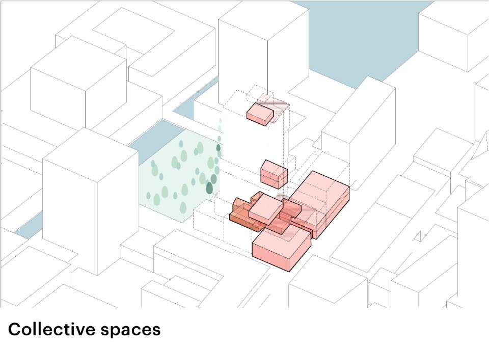 La metà inferiore contiene proprietà in affitto con accesso agli spazi comuni sui diversi tetti terrazzati che punteggiano l’edificio. Molti di questi tetti sono inoltre dotati di pergole che sostengono pannelli solari, consentendo spazi accessibili dove il relax convive con la produzione di energia.