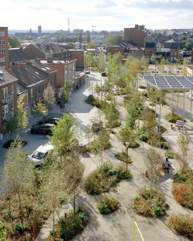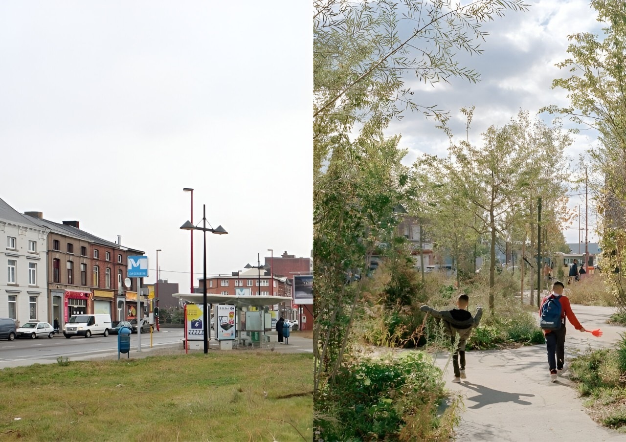 Tre sono le strategie fondamentali che strutturano il progetto. La prima è la creazione di una foresta urbana, un ecosistema rigenerato che agisce come infrastruttura ambientale e sociale, collegando le parti disgiunte della città. La seconda azione riguarda la Place Destrée, precedentemente semplice superficie per auto, che viene riconfigurata come una grande piazza pubblica flessibile, pronta a ospitare mercati, eventi, momenti di incontro quotidiano.