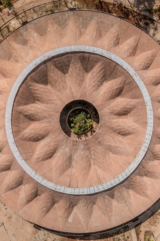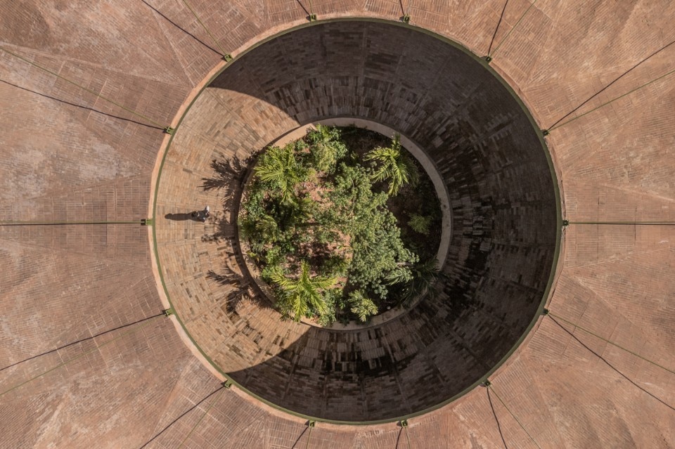 La disposizione delle funzioni segue una logica circolare: volumi di forma tonda collegati da archi tangenti strutturano il parco in una sequenza continua, evitando gerarchie e favorendo un'esperienza spaziale fluida. Il percorso si sviluppa tra corsi d’acqua e aree ombreggiate, fino a concludersi nell’arena, il volume principale del complesso.