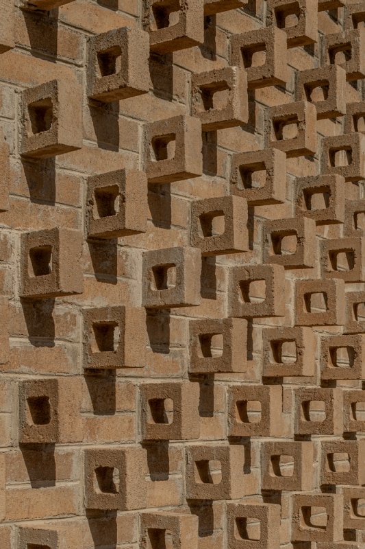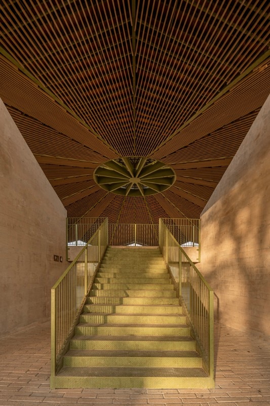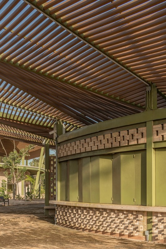 La progettazione conserva una bassa densità per preservare la vegetazione esistente. I materiali scelti rispondono al contesto climatico locale: telai metallici leggeri, finiture in legno, pareti in mattoni forati per la ventilazione naturale, coperture in tegole, superfici chiare per limitare l’assorbimento di calore. Tutte le strutture sono modulari, per semplificare la costruzione e contenere i costi.