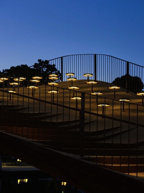 L’esperienza pedonale è articolata lungo una rampa accessibile che incorpora sezioni con gradini antisdrucciolo e zone di sosta informali. Sul lato nord, tratti più inclinati ospitano superfici per sedersi, mentre una rete integrata in pannelli forati si affaccia sul parco, offrendo spazi di incontro e punti di vista elevati. Le forature riducono l’impatto visivo e alleggeriscono la massa percepita.