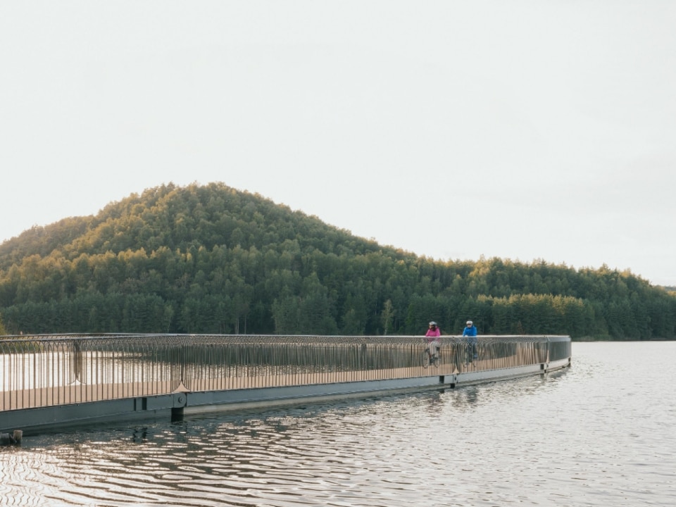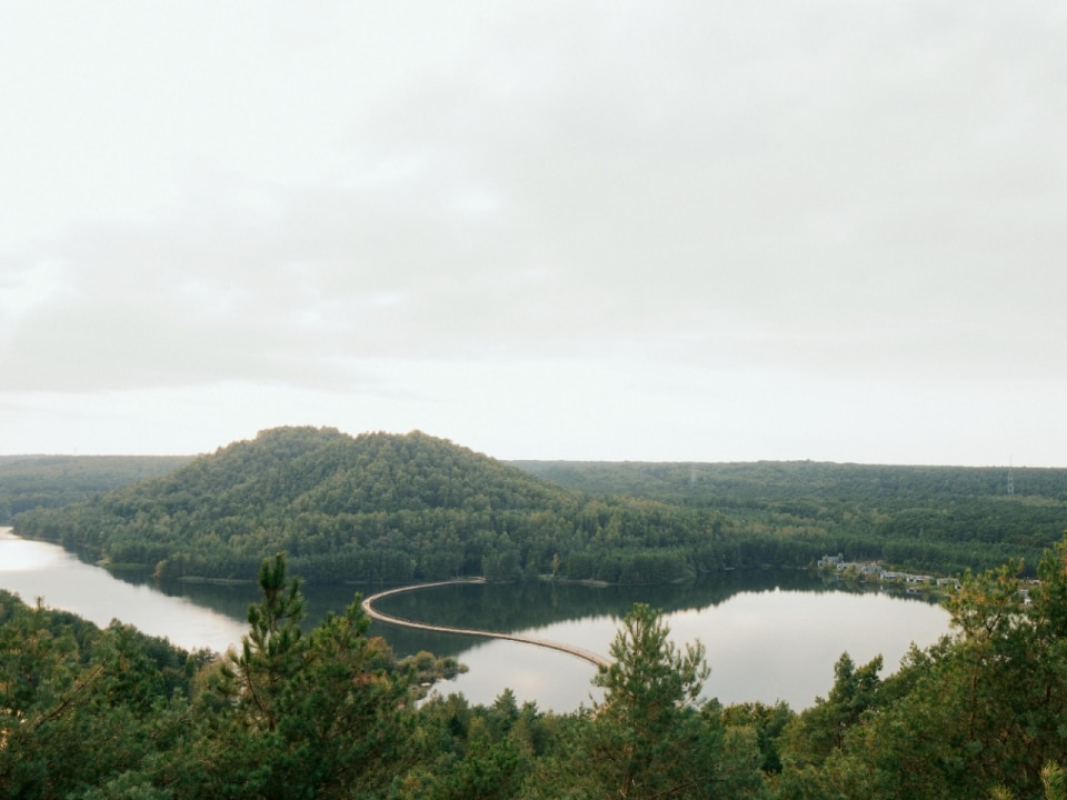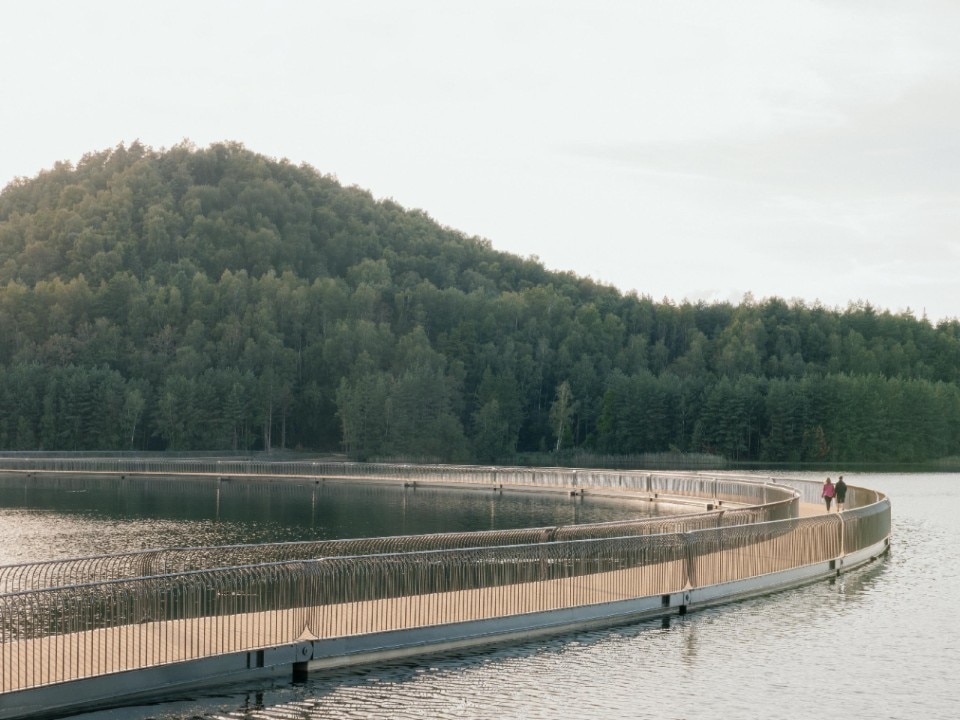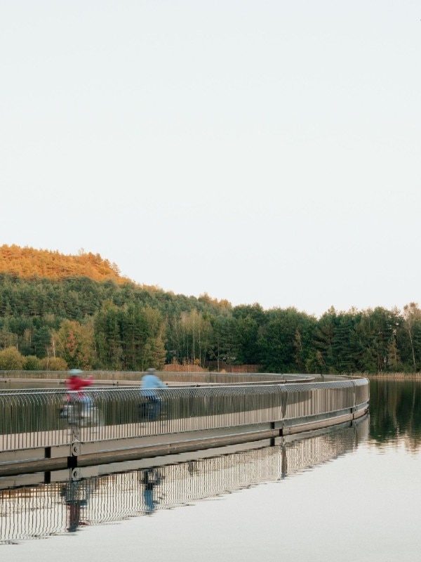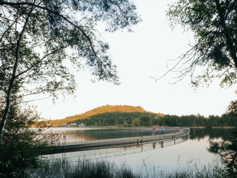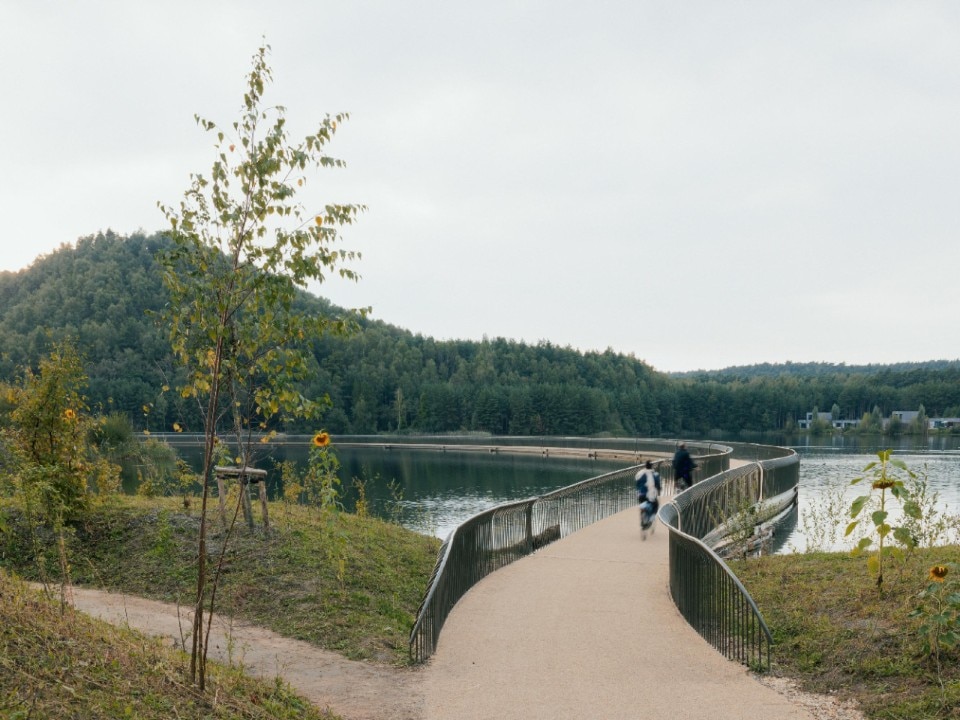 Incastonato tra due colline artificiali di scarti minerari, il ponte ciclabile galleggiante “Cycling between Terrils” attraversa lo specchio d’acqua formatosi da un’ex cava di ghiaia nei pressi di Limburgo, in Belgio. L’estrazione del carbone nel Novecento creò in quest’area grandi cumuli di detriti (terril) e un vasto lago artificiale. Oggi, il paesaggio è ancora dominato dai terril nonostante la chiusura delle miniere, e dagli anni 2000 la zona è rinata come parco ricreativo, vissuto da ciclisti ed escursionisti.