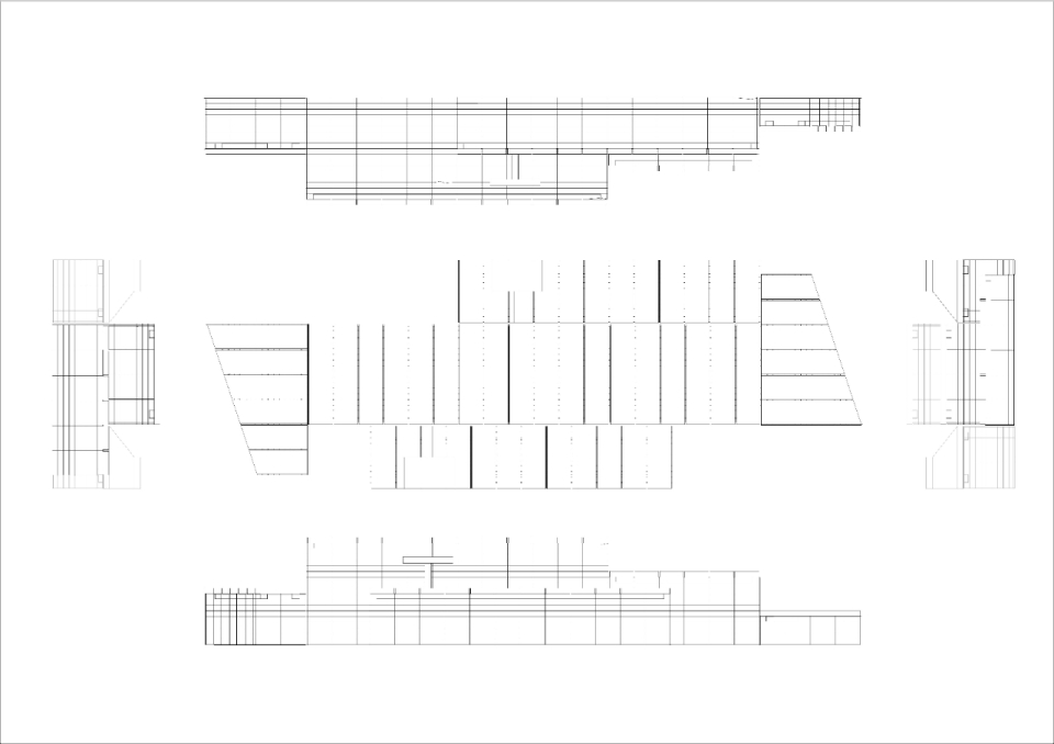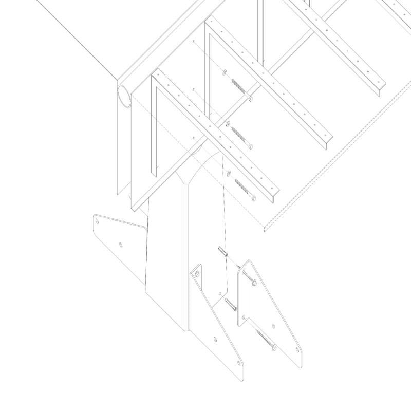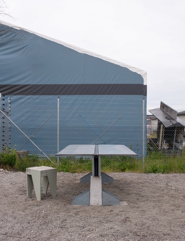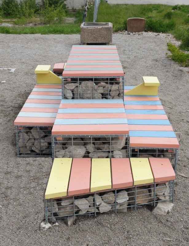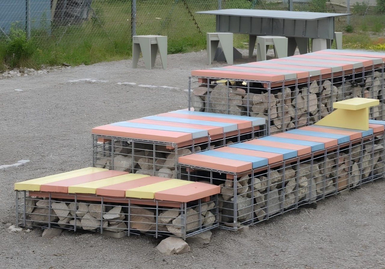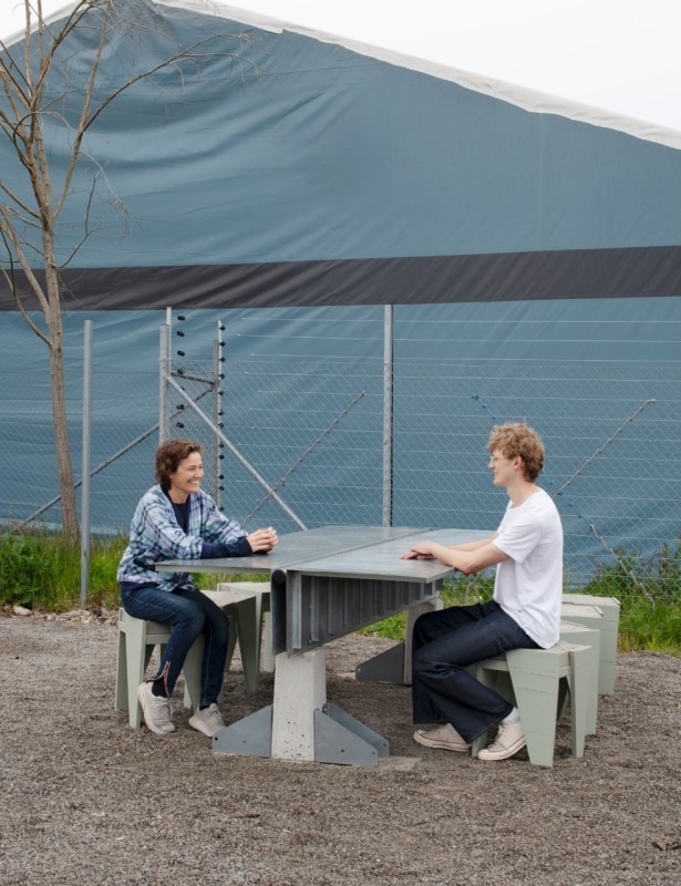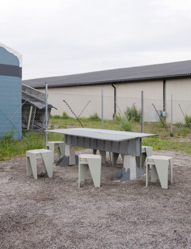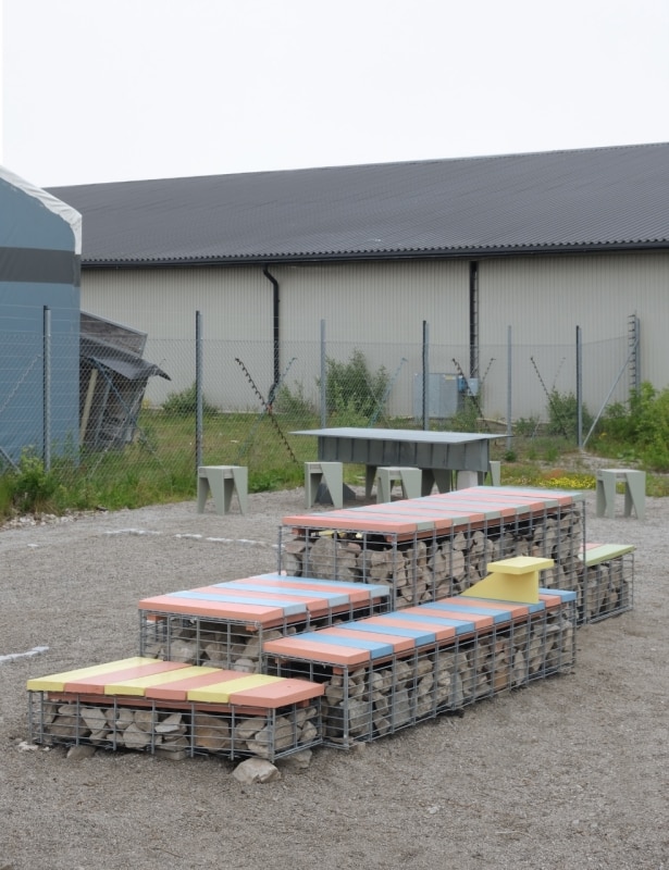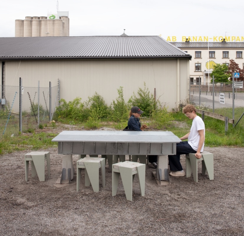 La materia prima del progetto è costituita dai materiali che circolano quotidianamente nel porto: recinzioni metalliche, travi lignee, elementi di calcestruzzo e pietre provenienti da scavi cittadini. Le barriere che normalmente delimitano e separano diventano quindi sedute e superfici comuni; le travi usate per i getti in cemento, riverniciate con colori recuperati dai negozi locali, si trasformano in pavimentazione; i basamenti in calcestruzzo e i pali di vecchi cartelli stradali sostengono invece un grande tavolo, completato da profili metallici di recupero che creano un piano generoso su entrambi i lati. Anche le sedute, realizzate con scarti di compensato e piastrelle in calcestruzzo, riflettono lo stesso principio di riuso.