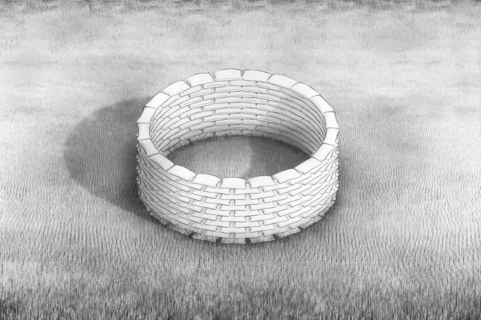 L’installazione è composta da elementi gonfiabili, simili a cuscini, impilati in un anello circolare. La configurazione non genera una barricata impenetrabile, ma un perimetro accessibile che definisce uno spazio per la sosta e la riflessione. La trasformazione del motivo del sacco di sabbia da strumento di difesa a dispositivo spaziale ne sposta il significato dal piano militare a quello culturale e artistico.