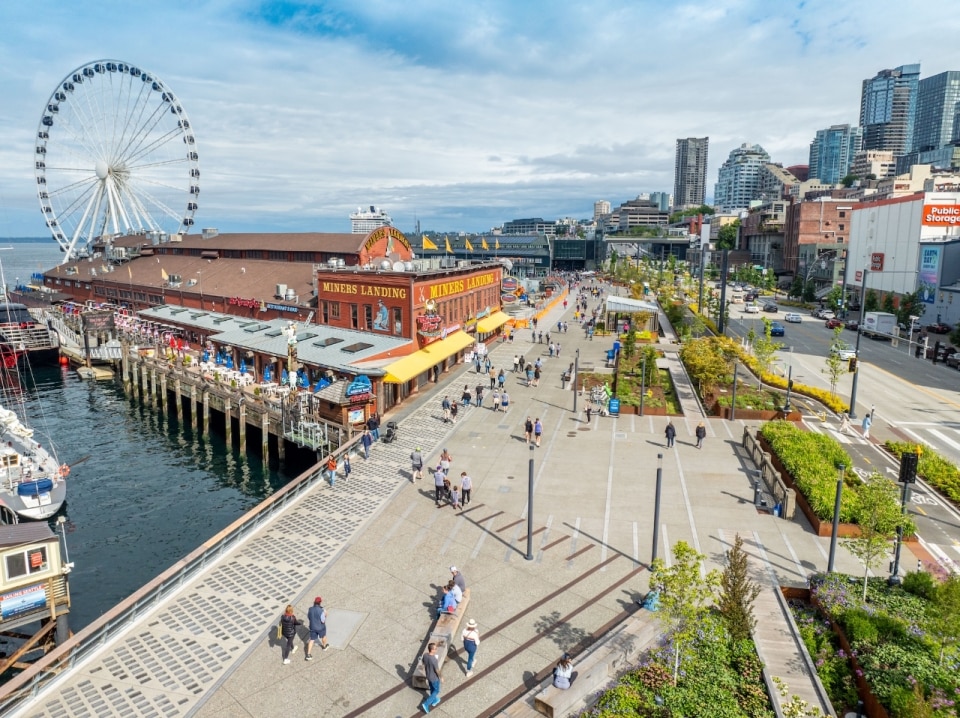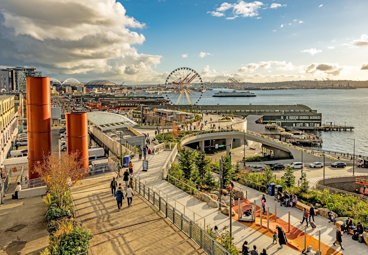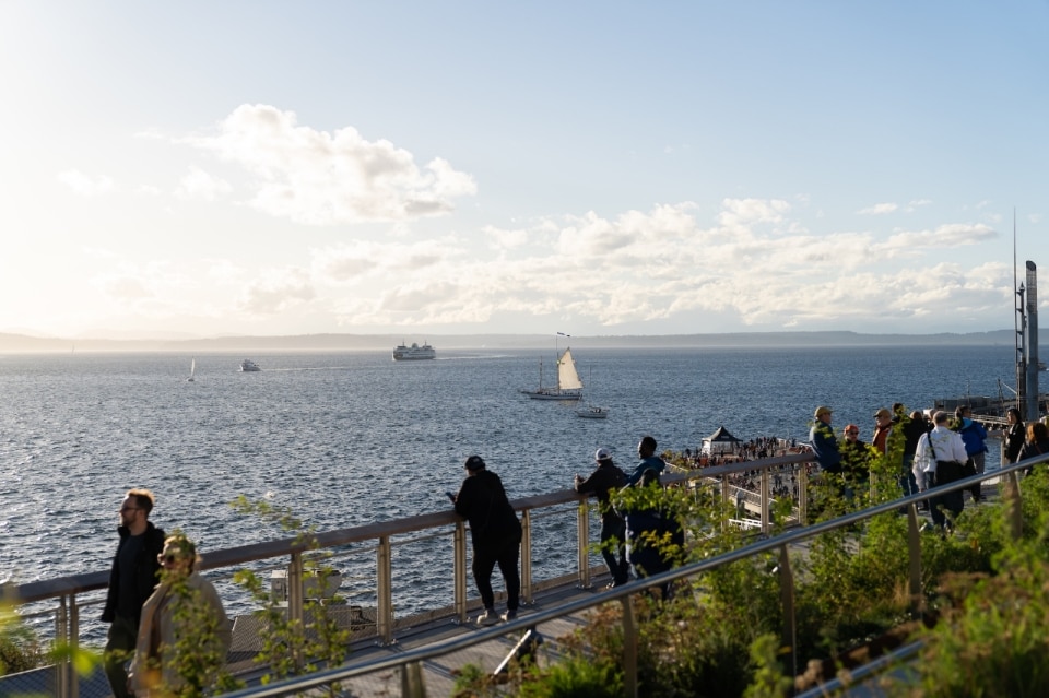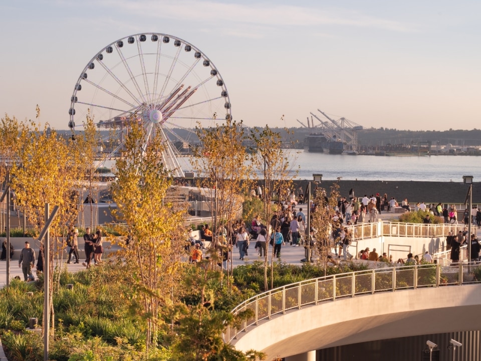 Il parco si sviluppa per 26 isolati, collegando Pioneer Square a Belltown e restituendo continuità tra il centro, Pike Place Market e la linea d’acqua. Elemento cardine del progetto è l’Overlook Walk, una passerella sopraelevata che riconnette il mercato storico all’Acquario e ai moli commerciali, offrendo viste panoramiche sulla baia e sullo skyline.