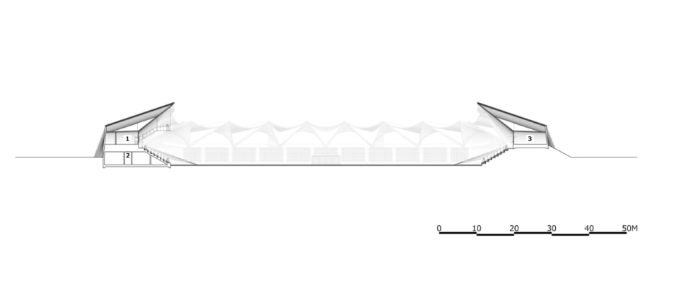 Lo stadio si articola in quattro volumi distinti, ciascuno inferiore a 3mila metri quadrati, con un massimo di due piani e un’altezza di 16 metri. Gli spazi tra i volumi funzionano come ingressi e punti di connessione. Al piano terra trovano posto spogliatoi, servizi e aree ristoro, mentre il secondo livello della tribuna principale ospita le zone VIP e le cabine per le riprese televisive. Una delle tribune posteriori integra inoltre funzioni ricettive, con camere d’albergo destinate a generare entrate complementari.