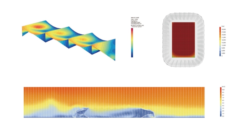 Dal punto di vista strutturale, il progetto propone l’impiego di Hyperbolic Paraboloid Shells in legno lamellare. L’assemblaggio utilizza elementi lignei di piccola sezione, disposti con rotazioni progressive per definire superfici curve. Sopra di essi altri elementi sono tesi in forma catenaria, dando vita a coperture leggere ma capaci di grandi luci. L’insieme richiama i tetti spioventi delle case tradizionali di Ōuchi-juku, reinterpretati in chiave contemporanea per ottimizzare illuminazione naturale, ventilazione e ombreggiamento stagionale.