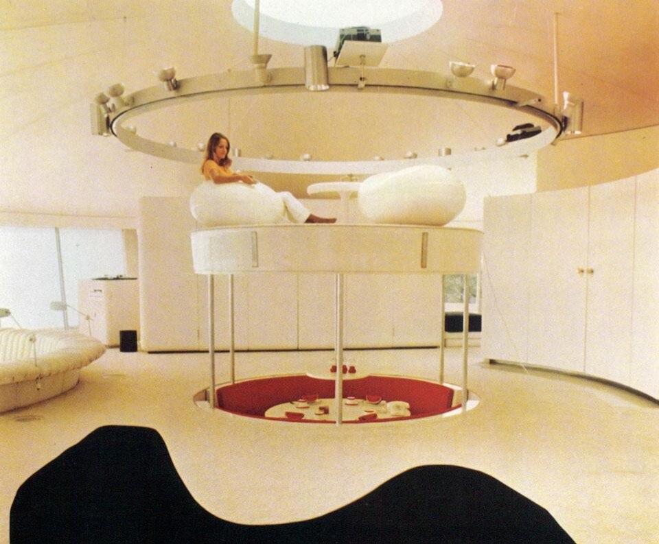 La zona centrale del pavimento si solleva ed appare, in sua vece, il posto per mangiare: una panca circolare con al centro il tavolo già apparecchiato: il tutto sale, già pronto, dal piano inferiore, dove si trova la cucina, un'altra camera da letto, dei ripostigli, dei servizi in più.