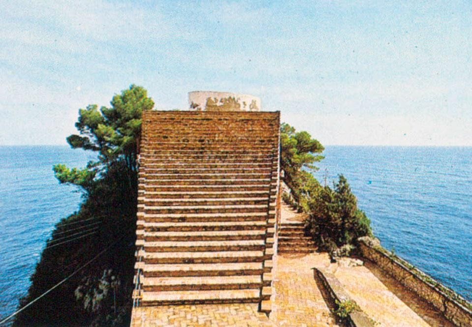 È il dramma dell’uomo e della natura, della nascita e della morte, della espansione e della compressione, del sacrificio e dell’accettazione. Elemento di primaria importanza qui è la scala, che sale e termina sulla superficie piana del tetto a terrazza. Ha una doppia funzione: porta, in salita, alla visione del cielo e del mare, e in discesa è invece una gradinata-teatro, in cui il pubblico (immaginario) siede con le spalle alla linea del mare e con gli occhi fissi ad un punto di fuga frontale. Un punto che scompare entro una buia cavità, circondata da piante e da rocce.