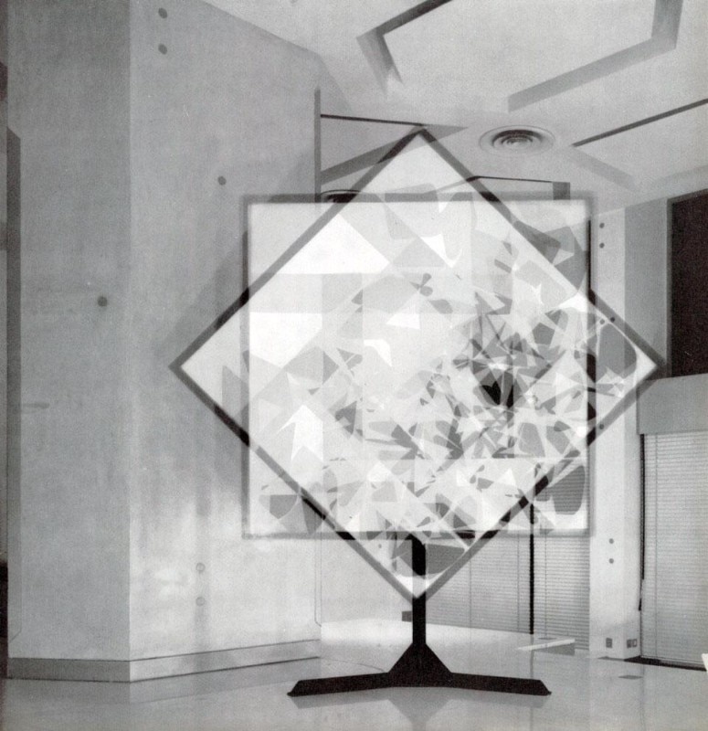 L'arte programmata di Enzo Mari ha chiuso la prima stagione: ma il suo Oggetto, interessante come opera moltiplicata, di rigorosa fantasia, non implicava un'ambientazione architettonica e decorativa; era un pezzo che poteva anche essere ammirato in qualsiasi altra sala. Implicava però, dentro i limiti dell'oggetto stesso, una particolare mobilità spaziale: nella provvisoria disposizione dei vari elementi che, nel corso delle rotazioni, assumevano con mutevole equilibrio ritmi diversi. Enzo Mari del resto è tra gli artisti di oggi più inclini a strutturare in modo nuovo lo spazio attivo, con effetti decorativi funzionali. Questa volta ha esposto solo un singolo pezzo.