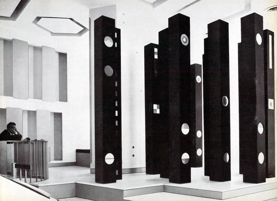 Da due anni si susseguono mostre: ma è qui il punto, non sono le solite mostre coi quadri o con sculture da cavalletto: si tratta di manifestazioni in cui il rapporto spaziale di architettura, scultura, grafica viene a risolversi in modo unitario e nuovo. Ovviamente, non tutte queste mostre hanno risposto a tale criterio di nuova decorazione funzionale in uno spazio attivo.