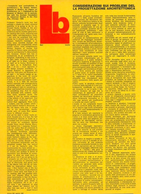 Una delle prime occorrenze del nome di Venturi sulle pagine di Domus risale al 1967, quando la rivista pubblicò una recensione di Complexity and Contradiction in Architecture [trad. it. Complessità e contraddizioni nell'architettura, Bari, Dedalo, 1977], il libro che Venturi aveva pubblicato l’anno prima con il Museum of Modern Art e con la Graham Foundation for Advanced Studies in the Fine Arts. La recensione (Domus 453, p. 49), firmata da Joseph Rykwert, non occupa più di una colonna della rivista (un quarto di pagina) e non manca di punte critiche: “Il libro del professor Venturi è stato forse anticipato con qualche pubblicità di troppo”, scrive Rykwert. Il libro, definito “ironico, affascinante e davvero abbastanza autodenigratorio” era secondo Rykwert, profondamente radicato nel sistema Beaux-Arts pur senza mostrarlo esplicitamente. Più incline alla lode verso la fine del testo Rykwert confessa di stare dalla parte di Venturi – “anche i funzionalisti ci hanno abbandonati” – prima di concludere: “Non sono sicuro di essere pronto a lanciare tre hurrah per Venturi, ma se li volesse potrei dargliene due e mezzo”.