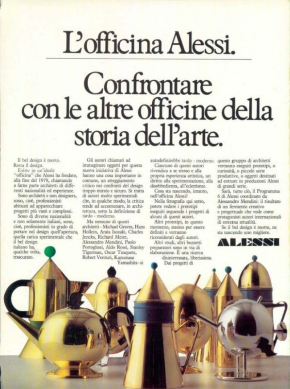 L’eredità culturale di Robert Venturi si tramanderà tanto grazie alla sua scrittura acuta e analitica quanto grazie ai suoi originali edifici. E tuttavia, come ogni buon genio postmoderno, Venturi non limitò la sua creatività a libri ed edifici. Nel 1981, accanto a Michael Graves, Hans Hollein, Arata Isozaki, Charles Jencks, Richard Meier, Alessandro Mendini, Paolo Portoghesi, Aldo Rossi, Stanley Tigerman, Oscar Tusquets, Kazumasa Yamashita, progettò per l’imprenditore Carlo Alessi nuove linee di oggetti sperimentali d’acciaio da produrre in tiratura limitata (Domus 623, p. 45). Un’intera pagina della rivista è dedicata agli schizzi preparatori e a una foto della teiera e della caffettiera di Venturi (Domus 618, pp. 2-3). E solo qualche anno dopo, nel 1984, Venturi realizzò anche una collezione di sedie per Knoll. Le sedie, di legno multistrato curvato e verniciato, avevano schienali le cui forme alludevano a vari elementi tettonici ridotti a due dimensioni (Domus 653, pp. 74-75).