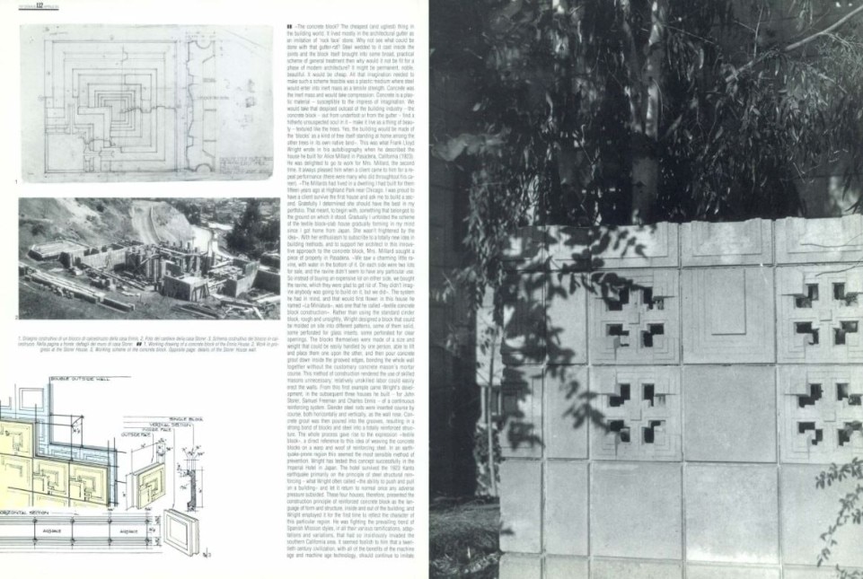 Queste quattro case, quindi, presentavano il principio costruttivo dei blocchi di calcestruzzo armati come un linguaggio formale e strutturale, all’interno e all’esterno dell’edificio; e Wright lo utilizzò per la prima volta per rispecchiare il carattere di questo particolare territorio. Si opponeva alla tendenza prevalente dello “stile Missione spagnola” in ogni ramificazione, adattamento e variante, che aveva così insidiosamente invaso la California meridionale. Gli pareva assurdo che una cultura del Ventesimo secolo, che godeva di tutti i benefici dell’era della macchina e della tecnologia dell’era della macchina, continuasse a imitare gli stili del Cinquecento. Inoltre, questa superficiale imitazione aveva poco a che fare con un’architettura democratica, o con un’architettura adeguata al territorio su cui sorgeva.