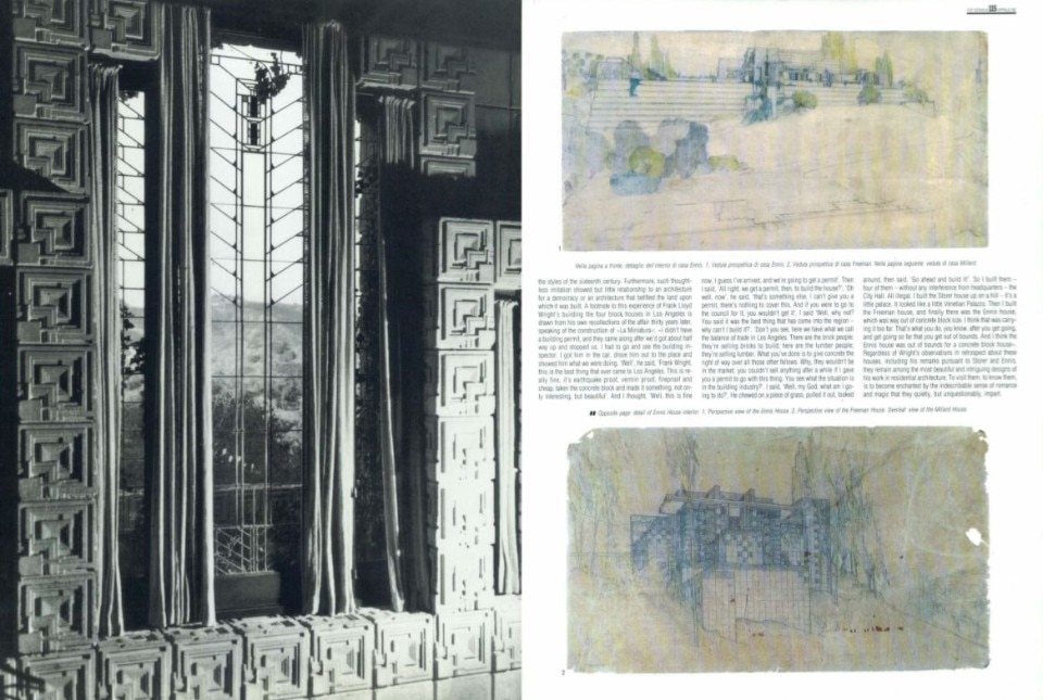 “Santo cielo”, risposi, “e io che faccio?”. Lui masticò un filo d’erba, lo sputò, si guardò intorno e disse: “Vada avanti a costruire!”. E io costruii – ne costruii quattro – senza obiezioni da parte dell’autorità, da parte del Comune. Tutto fuori legge. Costruii casa Storer in cima a una collina, un piccolo palazzo. Pareva un palazzetto veneziano. Poi costruii casa Freeman, e infine casa Ennis, che segnò la fine del metodo dei blocchi di calcestruzzo. Penso che lo portasse troppo in là. È quello che succede, sapete, quando si procede in una direzione, e si va tanto avanti da uscire dai limiti. E io credo che casa Ennis fosse fuori dei limiti, per una casa a blocchi di calcestruzzo”.
