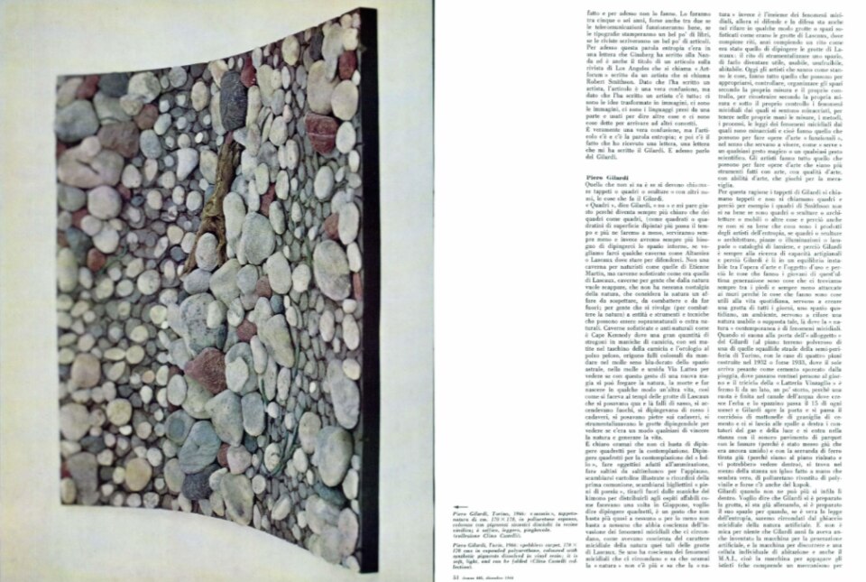 “Mi pare che Gilardi sia convinto di essere capace, in qualche modo, di prevedere e annunciare e raccontare quello che succederà, tanto che lo dice in tutti i cataloghi delle sue mostre: ‘I progetti sommari rappresentano una soluzione sommaria delle fondamentali esigenze dell'uomo nel prossimo futuro’. (...) La natura di Gilardi non è né igienica né confortevole. Non è un alibi ma è un rito. È una natura miserabile in perdita. Una natura di mele cadute, di zucche da orto di periferia quando i fiori felici dei piselli e dei fagioli, le zinnie e le dalie sono sfiorite e i frutti sono stati raccolti,(...) una natura in perdita. Il rito di Gilardi è come il rito nelle grotte di Lascaux: è il rito (...) per invocare coraggio davanti alla morte ricostruendo con le nostre povere mani l'avventura della sconfitta”. Così Ettore Sottsass apriva ai lettori di Domus una finestra sull’opera di Piero Gilardi, nel dicembre 1966 sul numero 445, presentando i suoi Tappeti-Natura in poliuretano.