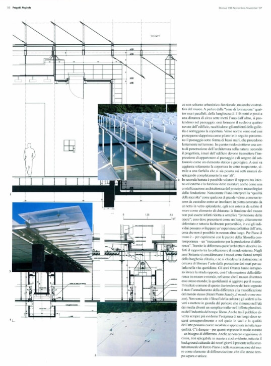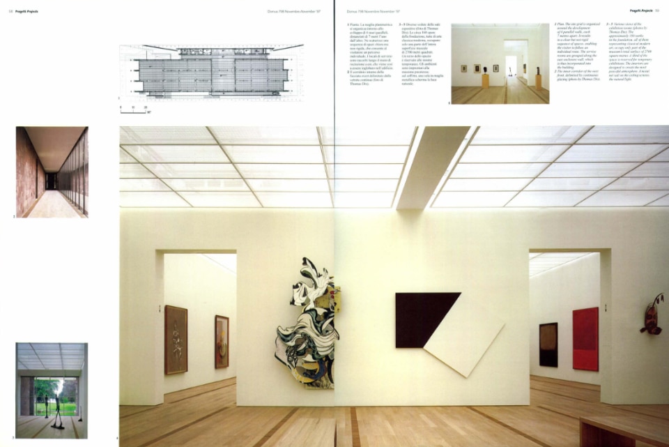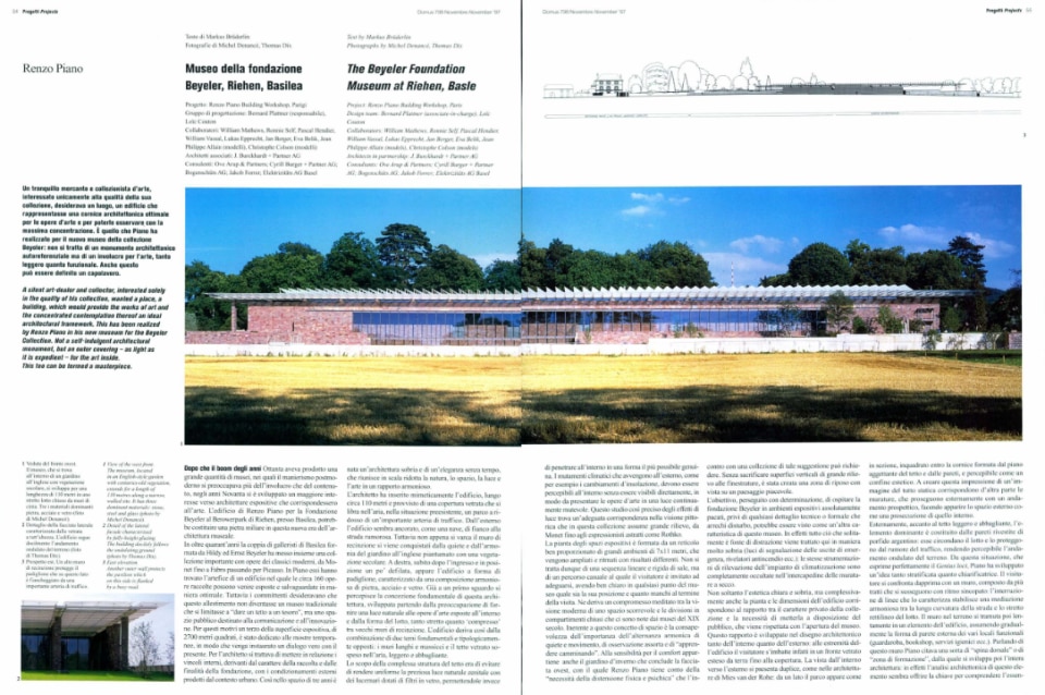 Quanto può essere delicata la relazione tra l’opera d’arte e lo spazio – tanto da mobilitare un dibattito che coinvolgerà da Benedetto Croce al Franco Albini di Palazzo Rosso a Genova – o ancora quella tra contenitore e contenuto, tra museo, opere e mondo? Una domanda complessa che, sul finire degli anni ‘80, dopo la stagione di musei postmoderni molto linguisticamente ingombranti, con le loro forme cariche di estetica, riferimenti e sottotesti, quasi stancava chi si trovasse a porsela. Per questa collezione di arte moderna presso Basilea che invece cercava valorizzazione delle opere, contatto con la dimensione pubblica della città e chiarezza nelle identità degli spazi, Renzo Piano porta la sua formula di risolutore delle complessità che proprio in quel periodo ha ormai affermato il suo ruolo centrale sulla scena globale dell’architettura, traducendosi quasi in un suo “stile” fatto di processo ed estetiche della discrezione, capace di trasformare un muro in “un elemento che allo stesso tempo separa e unisce”. Domus pubblica il progetto sul numero 798, nel novembre del 1997.