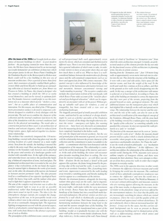 In oltre quarant’anni la coppia di galleristi di Basilea formata da Hildy ed Ernst Beyeler ha messo insieme una collezione importante con opere dei classici moderni, da Monet fino a Fabro passando per Picasso. In Piano essi hanno trovato l’artefice di un edificio nel quale le circa 160 opere raccolte possono venire esposte e salvaguardate in maniera ottimale. Tuttavia i committenti desideravano che questo allestimento non diventasse un museo tradizionale che si limitasse a “dare un tetto a un tesoro”, ma uno spazio pubblico destinato alla comunicazione e all’innovazione. Per questi motivi un terzo della superficie espositiva, di 2700 metri quadrati, è stato dedicato alle mostre tempora-nee, in modo che venga instaurato un dialogo vero con il presente. Per l’architetto si trattava di mettere in relazione i vincoli interni, derivanti dal carattere della raccolta e dalle finalità della fondazione, con i condizionamenti esterni prodotti dal contesto urbano. Così nello spazio di tre anni è nata un’architettura sobria e di un’eleganza senza tempo, che riunisce in scala ridotta la natura, lo spazio, la luce e l’arte in un rapporto armonioso.