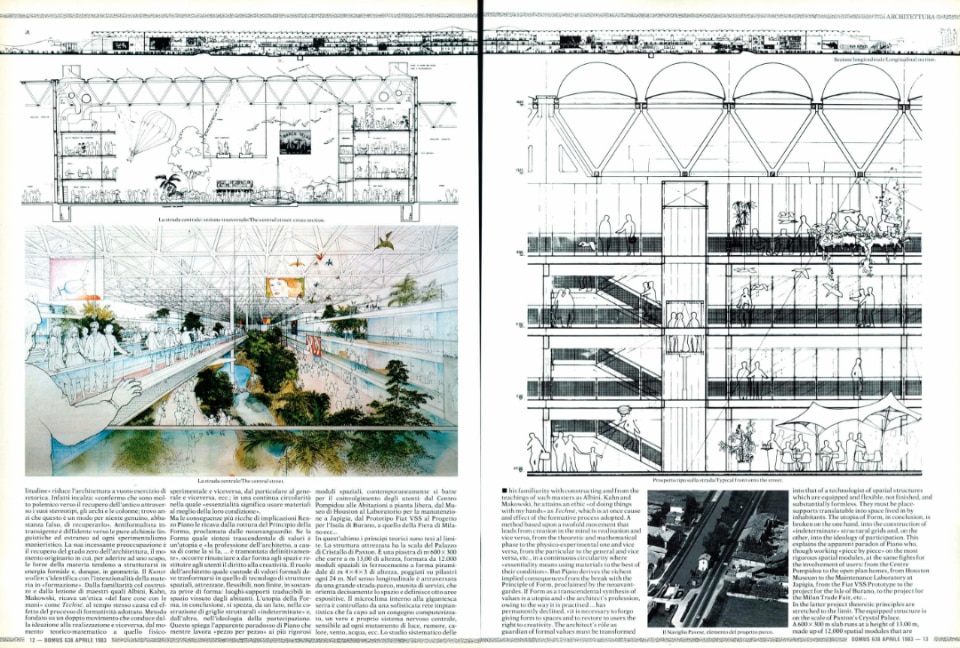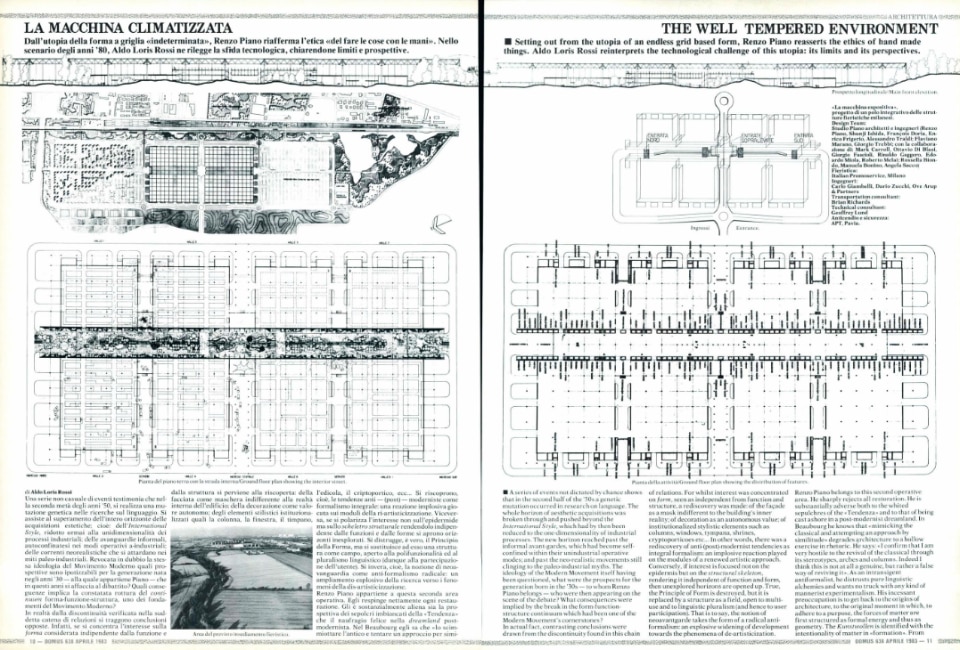 Succede che su Domus sia proprio Aldo Loris Rossi a usare un progetto di Piano, l’ipotesi di una nuova estensione per le fiera di Milano, tanto per esplorare in profondo l’atteggiamento “nuovo” del progettista genovese, quanto per tracciare un profilo dell’architettura in un’epoca, attraverso categorie critiche come quelle attraverso le quali Reyner Banham, quell’epoca, l’aveva creata. Il saggio, che in inglese non a caso è titolato The well-tempered environment – esce nell’aprile del 1983, sul numero 638.