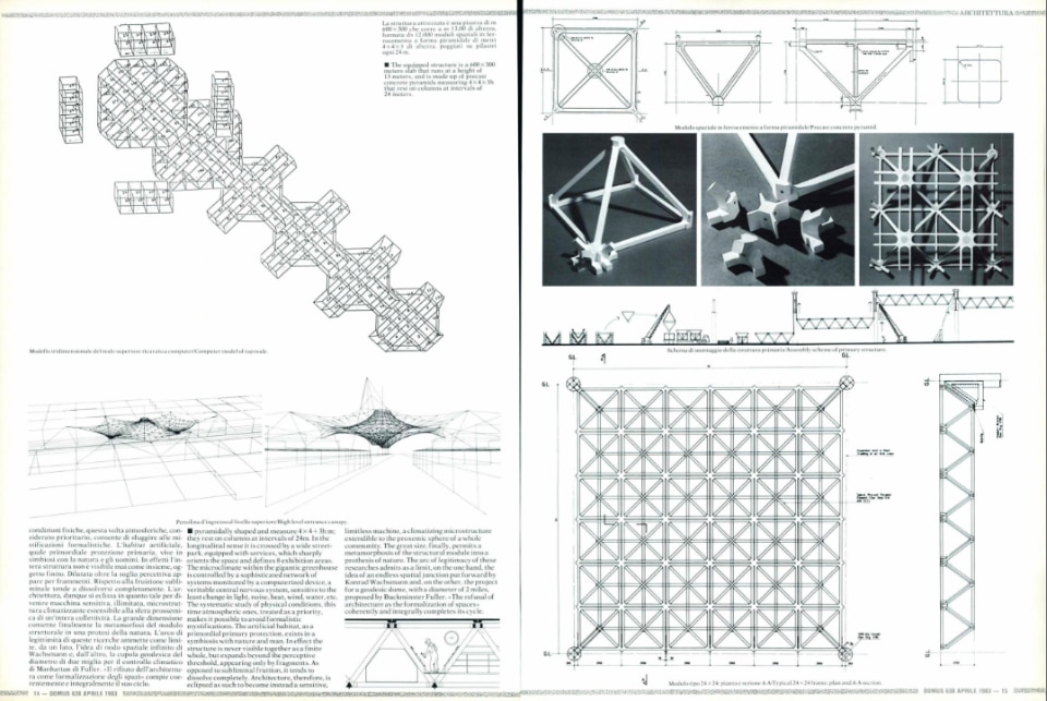 In quest’ultimo i principi teorici sono tesi al limite. La struttura attrezzata ha la scala del Palazzo di Cristallo di Paxton. È una piastra di m 600 X 300 che corre a m 13,00 di altezza, formata da 12.000 moduli spaziali in ferrocemento a forma piramidale di m 4x4x3 di altezza, poggiati su pilastri ogni 24 m. Nel senso longitudinale è attraversata da una grande stradaparco, munita di servizi, che orienta decisamente lo spazio e definisce otto aree espositive. Il microclima interno alla gigantesca serra è controllato da una sofisticata rete impiantistica che fa capo ad un congegno computerizzato, un vero e proprio sistema nervoso centrale, sensibile ad ogni mutamento di luce, rumore, calore, vento, acqua, ecc. Lo studio sistematico delle condizioni fisiche, questa volta atmosferiche, considerato prioritario, consente di sfuggire alle mistificazioni formalistiche. L’habitat artificiale, quale primordiale protezione primaria, vive in simbiosi con la natura e gli uomini. In effetti l’intera struttura non è visibile mai come insieme, oggetto finito. Dilatata oltre la soglia percettiva appare per frammenti. Rispetto alla fruizione subliminale tende a dissolversi completamente. L’architettura, dunque si eclissa in quanto tale per divenire macchina sensitiva, illimitata, microstruttura climatizzante estensibile alla sfera prossemica di un'intera collettività. La grande dimensione consente finalmente la metamorfosi del modulo strutturale in una protesi della natura. L’arco di legittimità di queste ricerche ammette come limite, da un lato, l’idea di nodo spaziale infinito di Wachsmann e, dall’altro, la cupola geodesica del diametro di due miglia per il controllo climatico di Manhattan di Fuller. “Il rifiuto dell’architettura come formalizzazione degli spazi” compie coerentemente e integralmente il suo ciclo.