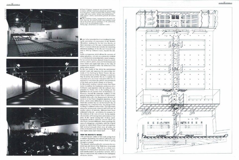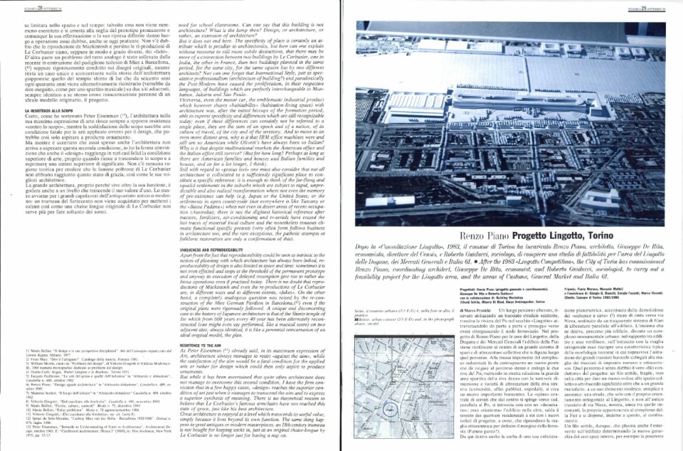 In questa lettura progettuale sembra quasi che Piano voglia esplicitamente congiungere alla celebrazione macchinista di Le Corbusier, la sofferta interpretazione di Persico, che vede nell’edificio il compiersi di “un ordine antico di obbedienza”. Tuttavia, al di là della schematica traduzione di quel programma generale di queste idee di architettura, leggibili soprattutto negli schizzi diagrammatici, ci sembra che il repertorio linguistico di Piano abbia difficoltà, in questa fase, ad esprimere in modo compiuto il passaggio dell’edificio ad un diverso “ordine urbano”: la logica che seleziona gli elementi architettonici fa ancora parte di un’altra sfera di interessi, diversa da quelli rivolti verso la città, come mostra, per esempio, la soluzione dell’ingresso principale. In questo procedimento analitico di scomposizione e soluzione delle parti, nel “non stare mai fermi” di quegli elementi “tecnologicamente perfetti” verso i quali si prova spesso una naturale diffidenza vi è forse l’insidia di una pericolosa “continuità” con il progetto originario, in cui Mattè Trucco aveva magistralmente risolto esigenze tutte interne all’intero ciclo produttivo: il rischio è che l’edificio si chiuda nuovamente su se stesso.