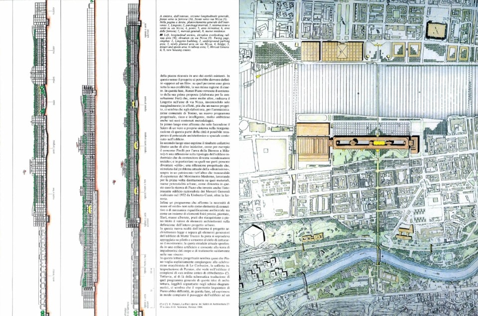 In secondo luogo esso esprime il risultato collettivo (frutto anche di altre iniziative, come per esempio il concorso Pirelli per l’area della Bicocca a Milano) di una riflessione sulla tipologia dell’edificio industriale che da contenitore diventa “condensatore sociale”; e in particolare su quali sue parti possono diventare “città”; una riflessione progettuale che, stimolata dal problema attuale della “dismissione”, scopre in un patrimonio tutt’altro che trascurabile di esperienze del Movimento Moderno, lavorando per la prima volta direttamente su quei materiali, nuove potenzialità urbane, come dimostra in questo caso la ricerca di Piano che investe anche l’interessante edificio razionalista dei Mercati Generali realizzato nel 1932 da Umberto Cuzzi, oltre la ferrovia.