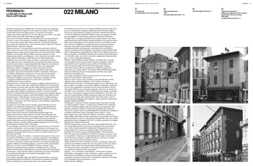 Oltre la sua formazione di architetto – è un laureato del Politecnico di MIlano – il nome di Italo Lupi è pietra di fondazione della cultura progettuale italiana come graphic designer, art director, ideatore e curatore di allestimenti, tanto che nel commentare un suo progetto costruito per l’Università di Trento, Domus parlava de “il grafico che volle essere architetto”. Presto infatti Lupi aveva preso la via del progetto visuale e del progetto che comunica, quando dopo un periodo da assistente per i Castiglioni era poi passato all’ufficio sviluppo della Rinascente, azienda centrale nella vicenda del Compasso d’Oro, premio al quale il designer resterà legato a lungo, vincendolo più volte e progettandone recentemente il Museo. L’editoria è forse il suo mondo d’espressione massima, portata avanti da art director e poi direttore di Abitare, e anche come art director di Domus tra il 1986 e il 1991: non era che l’inizio di un rapporto che anche oggi fatichiamo a pensare concluso, tanto che la dérive milanese nella quale Lupi ha coinvolto Domus nel luglio del 2015 – esce sul numero 993 – oltre ad avere il carattere di assoluta contemporaneità che la sua visione sulla città ha sempre comunicato, dà l’impressione di poter essere continuata anche in questo stesso momento, con altri passi di un discorso intimistico e al tempo stesso capace di parlare a chiunque, come sempre hanno fatto i suoi progetti.