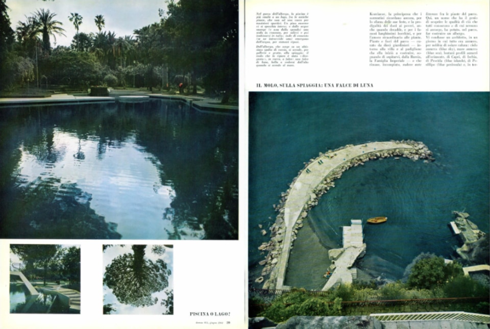 Vi condusse un architetto, in un giorno in cui tutto era azzurro, per nebbia di solare calura: cielo azzurro (blue sky), mare azzurro (blue sea), lontani profili azzurri all’orizzonte, di Capri, di Ischia, di Procida (blue islands), di Posillipo (blue peninsula) e, in terra, del Vesuvio (blue volcano). Disse l’architetto: sia azzurra e bianca, fuori, l’architettura, e bianca e azzurra dentro. L’architettura non gli riuscì di ottenerla fedele al progetto, nelle strutture e nelle finiture; ma dove natura aiutò, le cose andarono passabilmente bene: terrestre il verde percorso nel parco, fra alberi solenni; acquatica la verde piscina, che fu pensata non come un bacino per nuotatori sportivi, ma come uno specchio d’acqua per ninfe boschive, donde emergono brevi isole per i classici atteggiamenti, alla Récamier o alla Paolina, di femminili bellezze; e dalle acque emerge una scala di cemento, per salirvi e poi inabissarsi in tuffo.