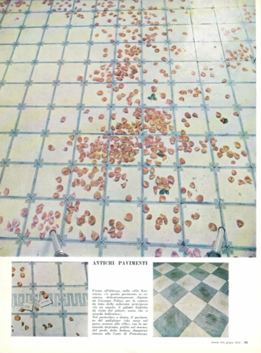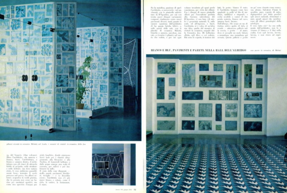 Fu la maiolica, passione di quell’architetto, a soccorrerlo: nei pavimenti, con le piastrelle salernitane di D’Agostino, per cui con trenta nuovi disegni variamente composti risultarono cento nuovi pavimenti diversi, tanti quante le camere (passione dell’architetto di far queste fatiche felici); e, nelle pareti delle sale, con le placche di ceramica Melotti, bianche e azzurre, nuvolose, murate, a rivestire i pilastri, nel modo che vedete, e per cui ogni volume invadente gli spazi perde consistenza, per virtù dei riflessi. Fra i disegni di nuove piastrelle offerti per l’esecuzione perfetta alla bravura salernitana dei D’Agostino, vi son lune (di miele) e geometrie naturali. E, sulle scale, ed all’ingresso, e fuori, l’architetto si è valso di un’altra sua idea, quella del mosaico di ciottoli in ceramica, eseguiti dalla Ceramica Joo. Di bellissimo effetto, egli dice; e voi vedrete. Blu sono le coperte, le testiere dei letti, le porte: bianco il resto. E l’architetto insegnò come fare spaghetti (e polli) al blu di metilene, sanissimi e stupendi; e scelse scodelle e vassoi di stupenda materia, bianca nel cavo, azzurra fuori. Invano.