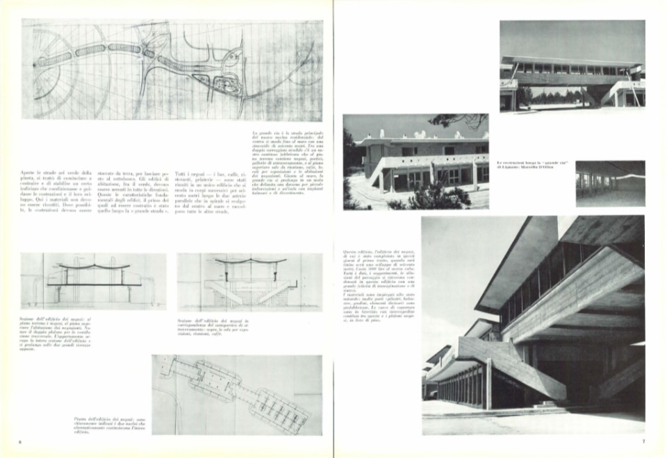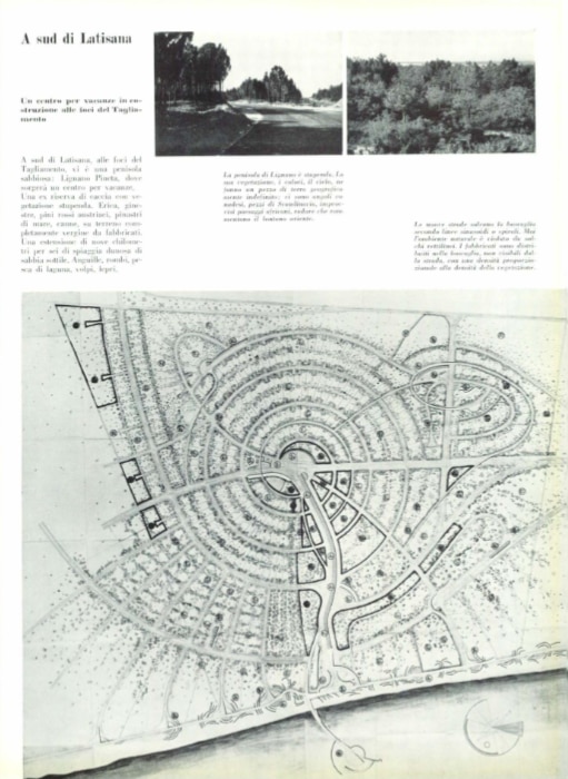 Una spirale, che cresce incrementalmente in ampiezza, è la figura attraverso cui D’Olivo traduce in realtà fisica il principio di attenzione al territorio che sta alla base di tutto il progetto: rinunciando allo schema convenzionale di vie perpendicolari al litorale, di uno sviluppo in sequenze continue di lotti, la pineta e il paesaggio esistente con tutte le sue specificità vengono integrati nel disegno e, infine, nello sviluppo stesso, come anche le tipologie architettoniche previste vogliono dimostrare. Una spiaggia “americanizzante”, la definirà Pasolini, col respiro però di un progetto di paesaggio e di natura. Pochi anni dopo l’inizio della vicenda, è l’agosto del 1954, Domus – che già due anni prima si era occupata di progetti di D’Olivo mettendoli in continuità con quelli di Wright – pubblica sul numero 297 una selezione di disegni e di prime fotografie di una Lignano Sabbiadoro intenta a crescere come esperimento pilota di un’urbanistica più vicina forse al concetto di territorio che non a quello di città.