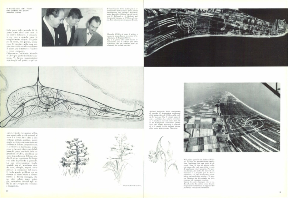 Chiamarono l’architetto Marcello D’Olivo per guidarli nella loro impresa. Vi furono numerosissimi sopralluoghi sul posto; e qui apparve evidente che qualora si fossero aperte delle strade normali al mare e si fosse dato adito a uno sviluppo edilizio qualsiasi, queste strade avrebbero automaticamente richiamato le loro perpendicolari, e avrebbero in brevissimo tempo entro la loro rete disgregato la bellezza del posto, costituita dalla vegetazione. D’Olivo, stabilitosi sul posto in una baracca di legno, studiò il piano regolatore del luogo e di tutta la penisola in generale. La sua preoccupazione fondamentale era di introdurre strade, case, alberghi, negozi, senza alterare la sensazione del bosco. E risolse questo problema con un sistema di strade curve a diversi centri: i diversi paesaggi, dune, pini, radure, mare, spiaggia, compaiono davanti agli occhi in uno svolgimento continuo e inaspettato.