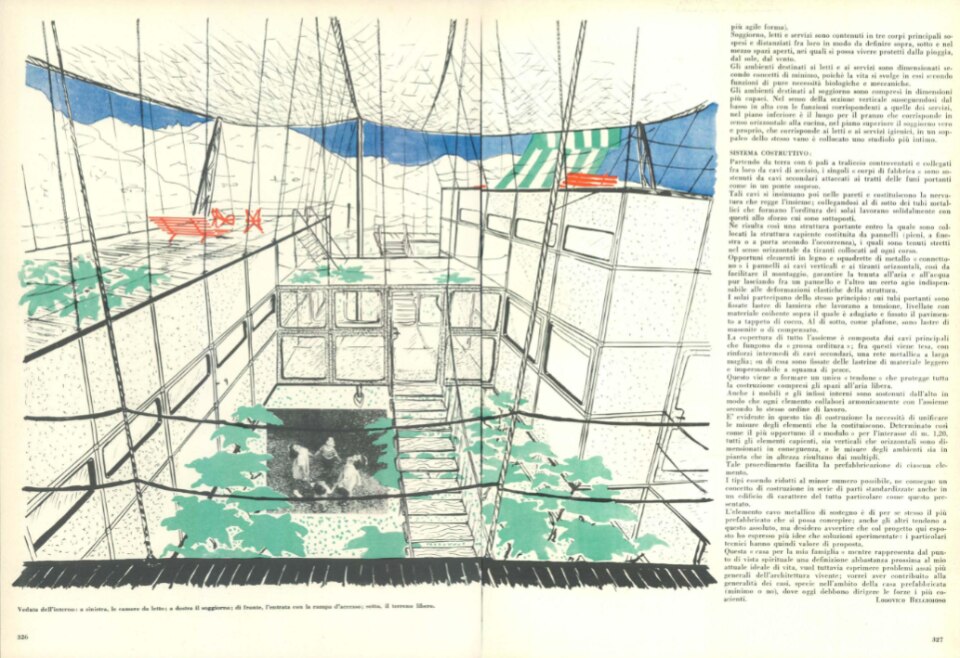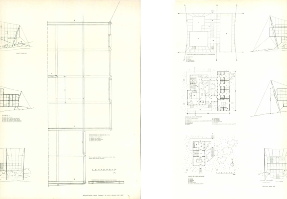 Genitori, quattro figli e servizi debbono trovare vita semplice ma organica: la libertà di ogni individuo nell’ambito armonico della famiglia. Non so concepire queste necessità senza dare alla casa ambienti ben definiti nelle diverse funzioni, spaziati fra di loro e compenetrati con la Natura, perché la vita si prolunghi oltre i locali chiusi, nelle zone aperte comprese fra le diverse parti. (I tradizionali elementi: porticato, patio, loggia, altana acquistano qui più agile forma). Soggiorno, letti e servizi sono contenuti in tre corpi principali sospesi e distanziati fra loro in modo da definire sopra, sotto e nel mezzo spazi aperti, nei quali si possa vivere protetti dalla pioggia, dal sole, dal vento.