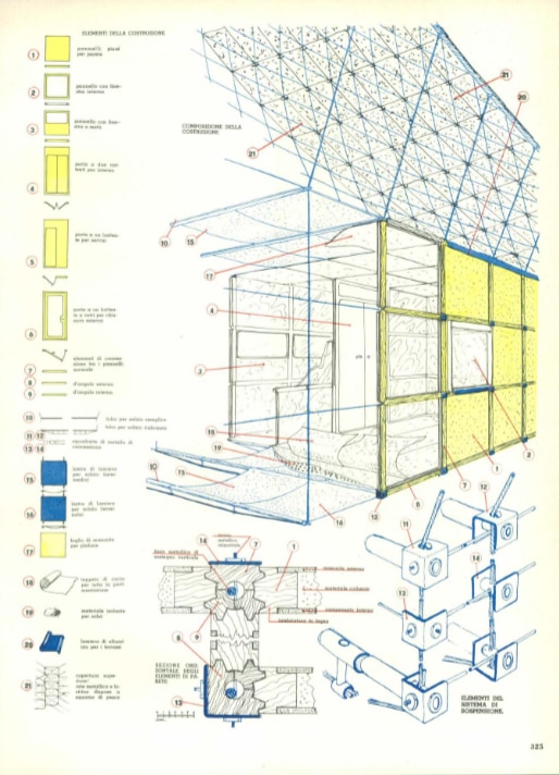 Tale procedimento facilita la prefabbricazione di ciascun elemento. I tipi essendo ridotti al minor numero possibile, ne consegue un concetto di costruzione in serie di parti standardizzate anche in un edificio di carattere del tutto particolare come questo presentato. L’elemento cavo metallico di sostegno è di per se stesso il più prefabbricato che si possa concepire; anche gli altri tendono a questo assoluto, ma desidero avvertire che col progetto qui esposto ho espresso più idee che soluzioni sperimentate: i particolari tecnici hanno quindi valore di proposta.