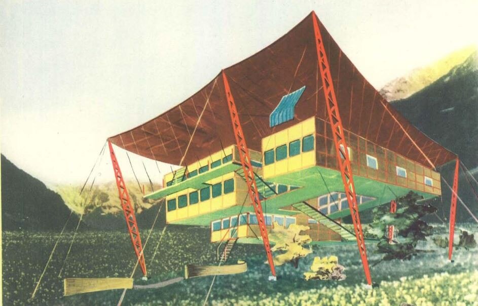 Partendo da terra con 6 pali a traliccio controventati e collegati fra loro da cavi di acciaio, i singoli “corpi di fabbrica” sono sostenuti da cavi secondari attaccati ai tratti delle funi portanti come in un ponte sospeso. Tali cavi si insinuano poi nelle pareti e costituiscono la nervatura che regge l’insieme; collegandosi al di sotto dei tubi metallici che formano l’orditura dei solai lavorano solidalmente con questi allo sforzo cui sono sottoposti.