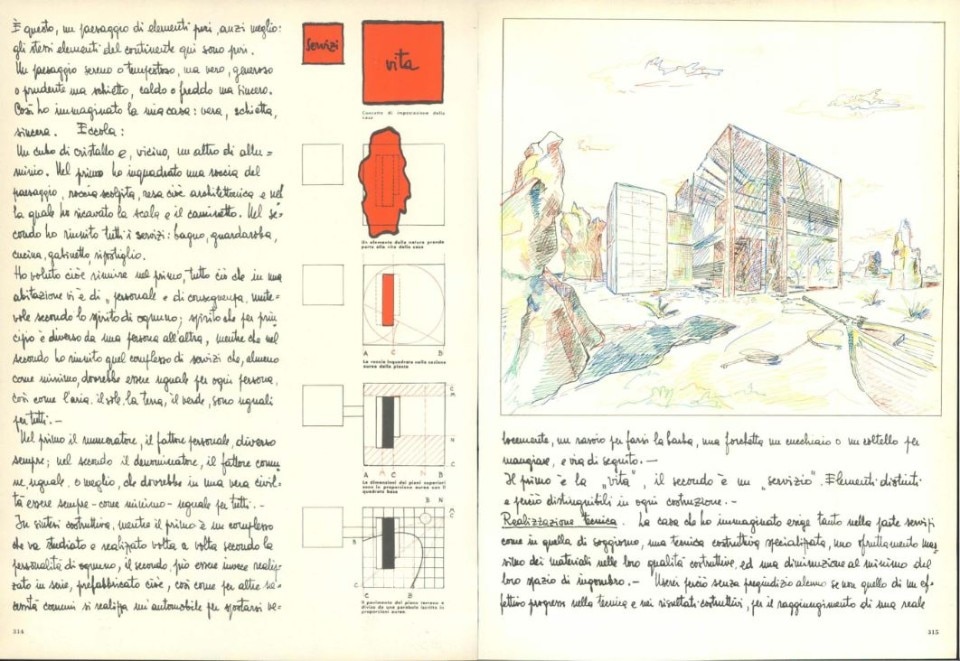 La casa che ho immaginato esige tanto nella parte servizi come in quella di soggiorno, una tecnica costruttiva specializzata, uno sfruttamento massivo dei materiali nelle loro qualità costruttive, ed una diminuzione al minimo dell’ingombro. Userei perciò senza pregiudizio alcuno sempre quello di un effettivo progresso nella tecnica e nei risultati costruttivi, per il raggiungimento di una reale comodità, dei materiali più adatti e, nello stesso tempo più puri (purezza intesa nel senso di riunione nel materiale stesso del massimo delle doti positive).