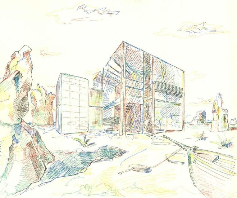 Un cubo di cristallo e, vicino, un altro di alluminio. Nel primo ho inquadrato una roccia del paesaggio, roccia scolpita, resa cioè architettonica e nella quale ho ricavato la scala e il caminetto. Nel secondo ho riunito tutti i servizi: bagno, guardaroba, cucina, gabinetto, ripostiglio.
