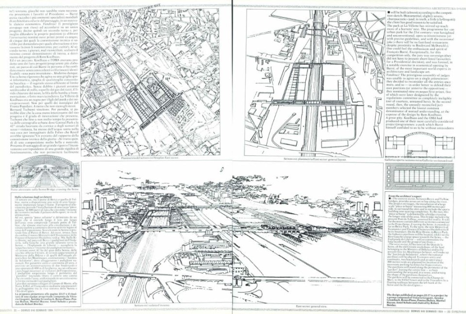 Ed è un peccato. Koolhaas e POMA avevano prodotto uno dei loro progetti/programmi più elaborati, un parco di cui Barré in persona ci ha confidato essere senza antecedenti o riferimenti identificabili: “una pura invenzione”. Moderno dunque. Uno schema rigoroso che agiva su una griglia quasi informatica, spoglia di qualsivoglia concessione bucolica – il vegetale stesso allineato al limite del parodistico. Senza dubbio i giurati avranno sentito odor di zolfo, o quello dei gas dei razzi, il livido chiarore dei neon, la fifa della bomba a frammentazione, e fatto marcia indietro. La Villette di Koolhaas era un regno per i figli del punk e dei microprocessori. Non per quelli dei nostalgici del Fronte Popolare. A meno che non siano gli stessi. Bernard Tschumi vincitore. Per parodia, si potrebbe dire che la cosa meno interessante del suo progetto è il grado di innovazione che presenta. Tschumi che fino a non molto tempo fa presentava delle coreografie urbane dove Central Park e la 42° strada facevano da cornice a degli scenari di sesso +violenza, ha messo dell’acqua santa nella sua coca per immaginare delle Folies che Restif avrebbe ignorato. Un estratto del rapporto della commissione tecnica della giuria: “Si tratta quindi di una composizione molto bella e notevole. Presenta il vantaggio di un grande rigore e l’inconveniente corrispondente di una grande rigidità di funzionamento, che non permetterà facilmente una appropriazione collettiva – del resto facile – di queste Folies. Il progetto rispetta il luogo e ne valorizza gli elementi principali con grande sicurezza e delicatezza”. In uno dei suoi manifesti, Tschumi diceva: “per fare l’esperienza dell’architettura si potrebbe anche essere indotti a commettere un omicidio”. È un’idea.