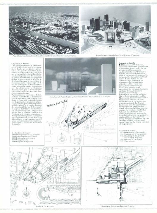 Per l’Opera della Bastiglia, nel momento in cui scriviamo queste righe, la decisione del Presidente della Repubblica è ancora sospesa. Con un programma tecnico e complesso, con un luogo impossibile, ben pochi concorrenti hanno saputo cavarsela. Al Presidente sono stati presentati tre progetti: uno post-moderno, uguale a tanti altri; quello del canadese Carlos A. Ott, che la giuria aveva attribuito a Richard Meier – alcuni funzionari del Ministero della Cultura avevano passato la notte a rivedere la sua opera completa, prima che venisse sciolto l’anonimato, per poter fare qualche intelligente osservazione –; infine quello del gruppo di Munteanu Georgesco Perreau, l’unico che avesse osato mescolare l’Opera e la piazza in uno spazio pubblico musicale. Il solo, anche, che avesse osato superare il programma degli scenografi proponendo di aprire la scena sulla piazza, a detrimento dei programmatori che pretendono, ovviamente, che questo “non funzionerà mai”, perché sono i soli a detenere l’unica e legittima verità. Il Presidente, debitamente indottrinato, opterà per lo pseudo Meier o si prenderà il rischio di offenderli? (N.d.R.: apprendiamo al momento della stampa che Mitterrand ha poi scelto il progetto di Carlos Ott).