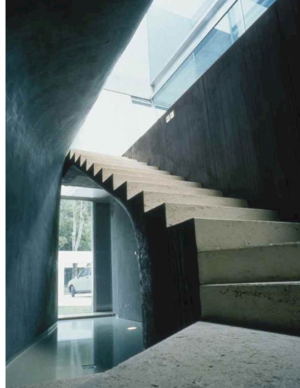 Una massiccia porta vetrata doppia, scorrevole e motorizzata, lunga otto metri e mezzo, si sposta di undici metri lungo il lato nord della casa di vetro. Il telaio è nascosto da pavimento e soffitto, per produrre un senso di trasparenza completa. Era un’eco di Casa Tugendhat, dove una enorme finestra affonda nello scantinato grazie a un motore? Al piano terreno una superficie piana consente alla sedia a rotelle libero accesso all’esterno. È come se la sedia a rotelle cancellasse la linea tra interno ed esterno, oltre a cancellare la distinzione tra macchina e casa. L’ambiguità di interno ed esterno è un gioco continuo. Con la grande finestra aperta e le tele appese fuori, lo spazio esterno diverrà interno e, viceversa, l’interno sarà l’estensione naturale della collina. Per andare da qui alle stanze dei ragazzi bisogna prendere la scala a chiocciola. In mezzo a tutta questa efficiente fluidità, improvvisamente una restrizione all’accesso. La sedia a rotelle non può entrare senza aiuto nel territorio più privato dei ragazzi. La casa dei ragazzi, a quattro lati, è stata divisa in tre, e ciascuna stanza è differente. Il dinamismo della pianta è un vortice che ha origine nella spirale. Questo movimento centrifugo accelerato si contrappone alla stabilità centripeta della casa vicina, in cui vivono i genitori. Il gioco di statico e dinamico si riflette anche del carattere differente delle cornici dei portali. Donna: in tutte le stanze ogni parete è differente: una è grigia, l’altra di legno, e la terza è graffita. La parete grigia si fa più scura a mano a mano che si passa da una stanza all’altra.