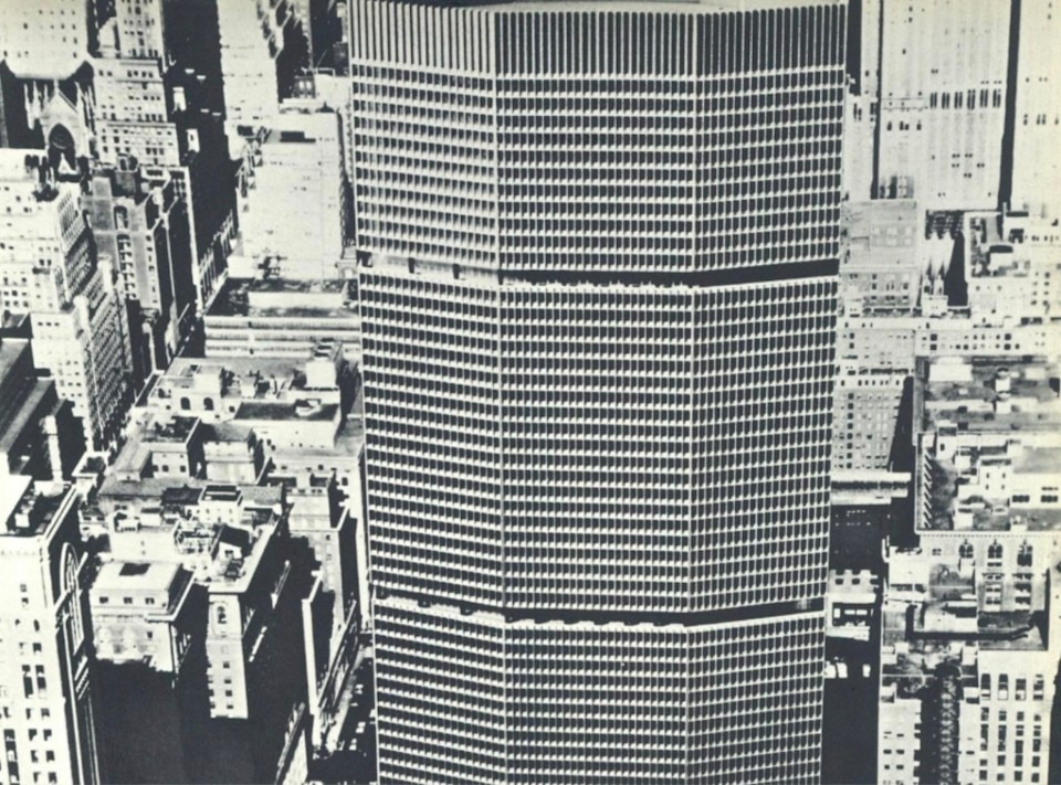 I grattacieli a New York hanno due aspetti: vi sono quelli costituiti da un complesso di gradoni, determinati non da un disegno ma dalla massima occupazione consentibile di “spazi ”, e che diremo “informais”; e quelli che hanno un loro disegno. Fra gli antichi, l’Empire State, il Chrysler, il Rockfeller ed altri che sorgono da terra con i loro volumi netti; e fra i moderni il palazzo dell’Onu, la Lever House, ben articolata con i volumi bassi orizzontali, e il Seagram, e il nuovo Time-Life.