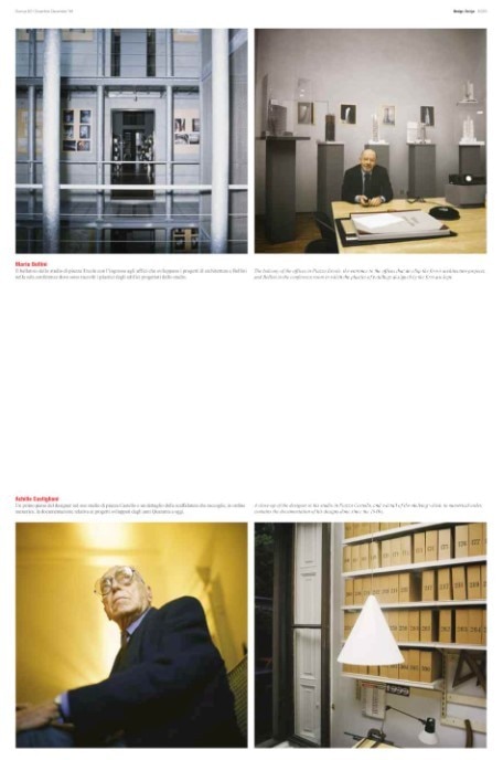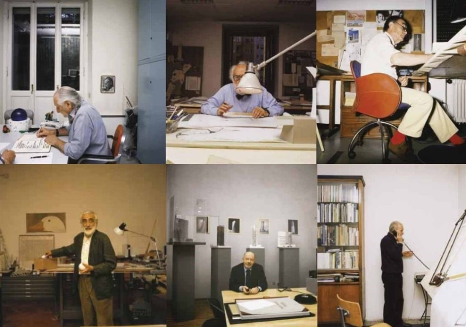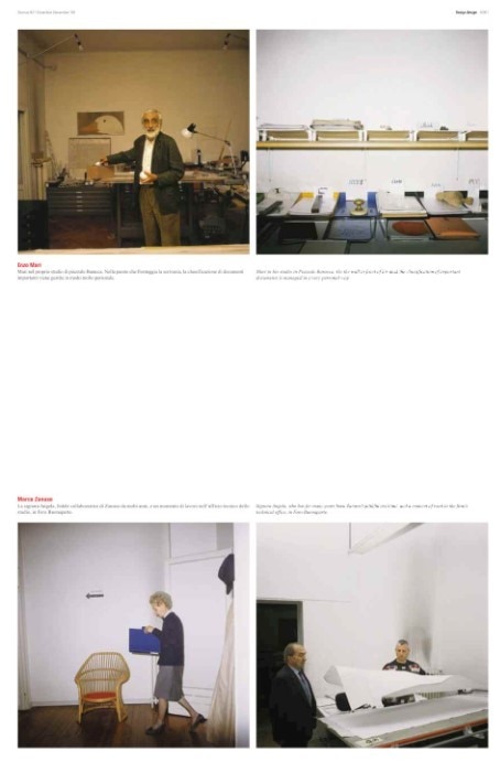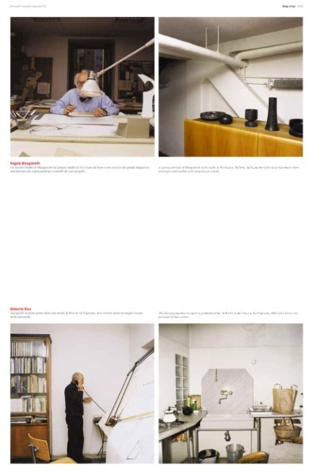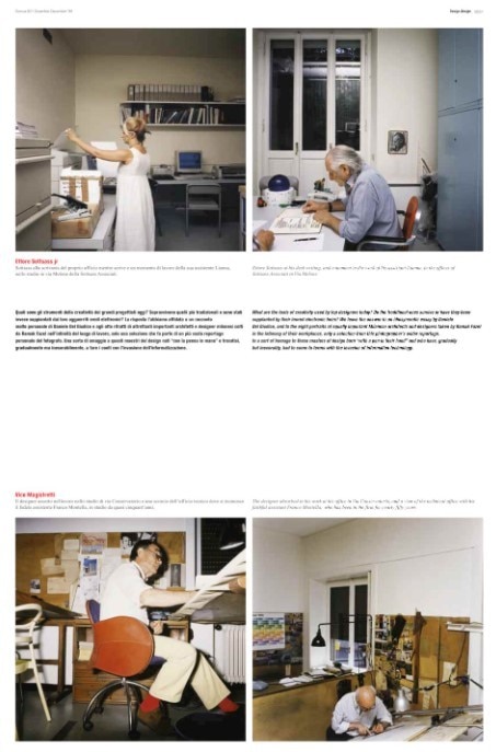 Il passaggio di millennio, più precisamente l’arrivo del 2000, lo ricordiamo per tante ragioni, ma l’idea di una rivoluzione digitale, di un’era internet dalle grandi promesse, e di una pervasività dei computer in tutti gli aspetti di vita e lavoro ha sicuramente occupato gran parte del dibattito culturale, 25 anni fa, tra deliri collettivi come il millennium bug e ripensamenti concreti di spazi e pratiche. “Quali sono gli strumenti della creatività dei grandi progettisti oggi?”, si chiedeva Domus, nel numero 821, l’ultimo del 1999. “Sopravvivono quelli più tradizionali o sono stati invece soppiantati dai loro agguerriti eredi elettronici?”. Oltre che in un saggio di Daniele Del Giudice, la risposta veniva cercata nelle fotografie di Ramak Fazel – conoscenza Domus di lunga data, che ci ha accompagnat quest’anno in esplorazione della Rai di Gio Ponti a Milano – i ritratti di otto maestri italiani del design e dell’architettura, incontrati nel loro spazio di lavoro, parte di un più vasto reportage. Sottsass, Magistretti, Mangiarotti, Riva, Mari, Zanuso, Bellini, Castiglioni, le loro persone di fiducia e i loro studi milanesi; gli archivi, le dispense, i tavoli di designer “nati ‘con la penna in mano’ e trovatisi, gradualmente ma inesorabilmente, a fare i conti con l’invasione dell’informatizzazione”.