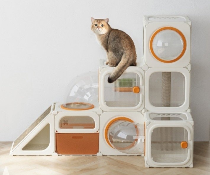 N Plus Magic House è un sistema modulare per felini che cita esplicitamente la Nakagin Capsule Tower: una micro-architettura componibile pensata per crescere in verticale, modulo dopo modulo.